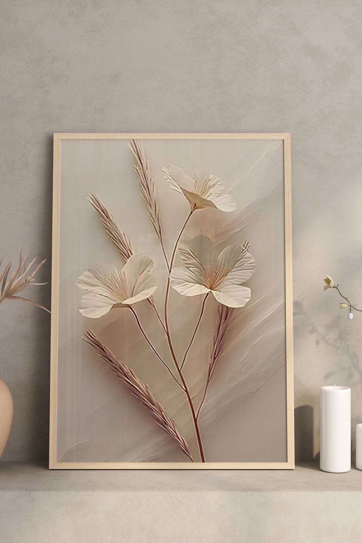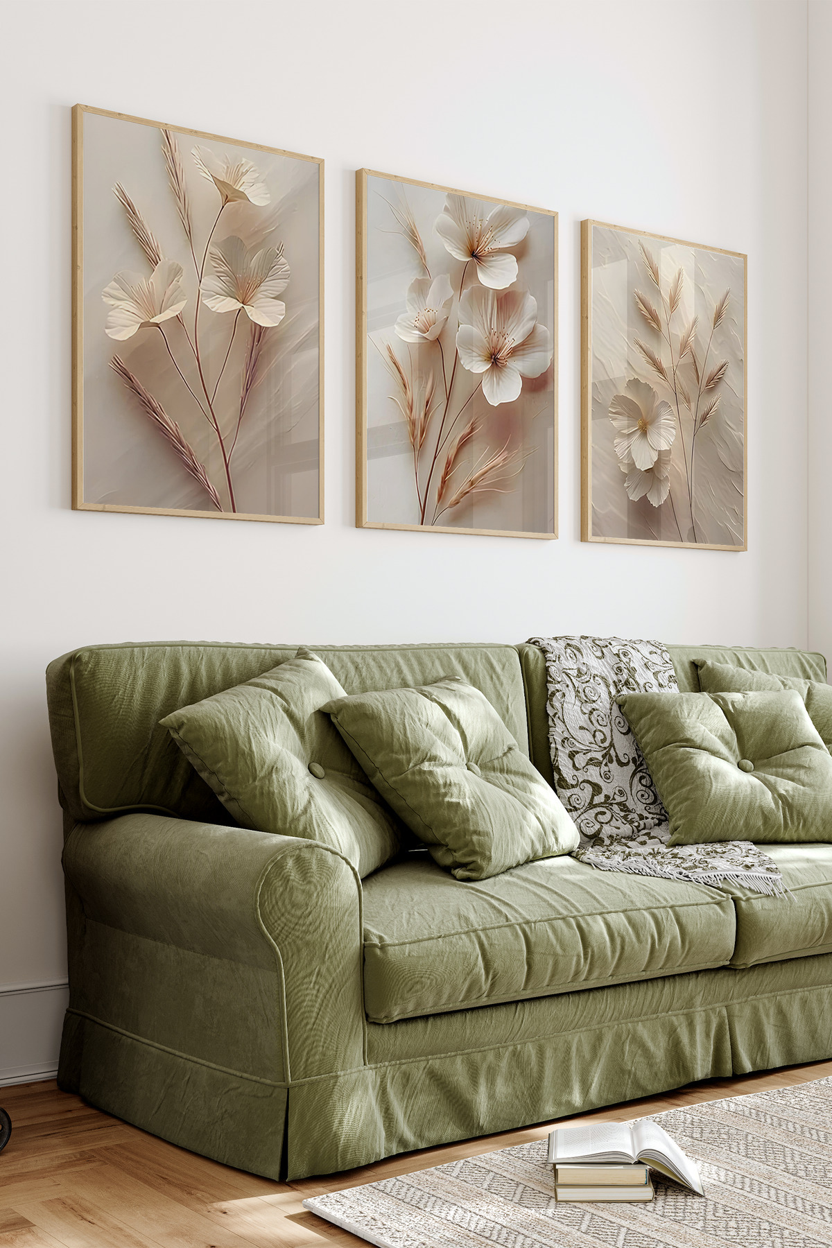 🖼️ 3'lü Çerçeveli Krem Çiçek ve Başak Desenli Tablo Seti – UV Baskılı MDF CRV1039