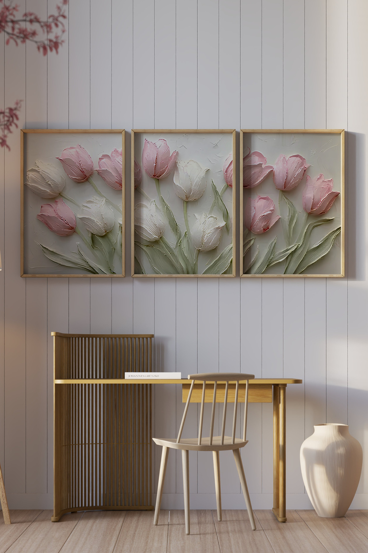 🌷 3'lü Çerçeveli Lale Desenli MDF Tablo Seti – Ahşap Çerçeveli, UV Baskılı, Silinebilir 🌷 CRV1025