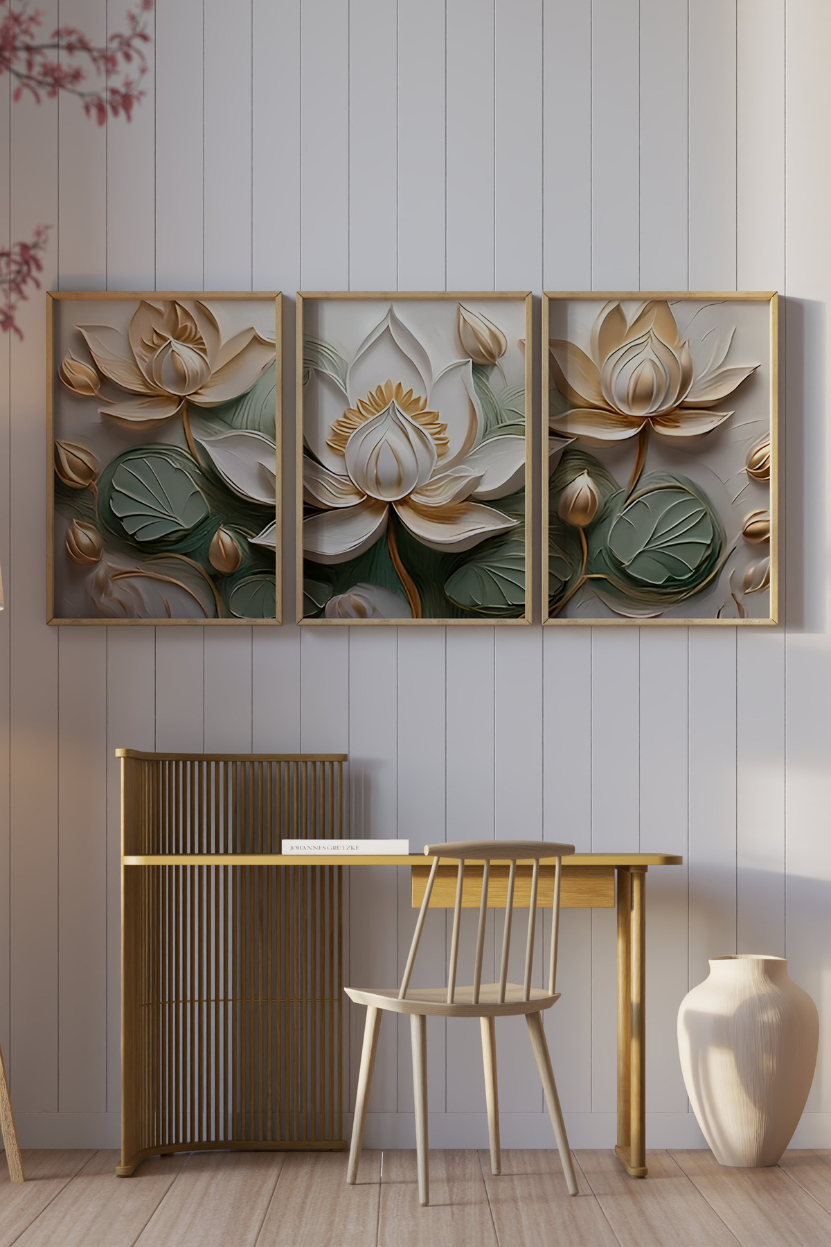 🌿 3'lü Çerçeveli Lotus Çiçek Temalı MDF Tablo Seti – Ahşap Çerçeve, UV Baskı 🪷 CRV1029