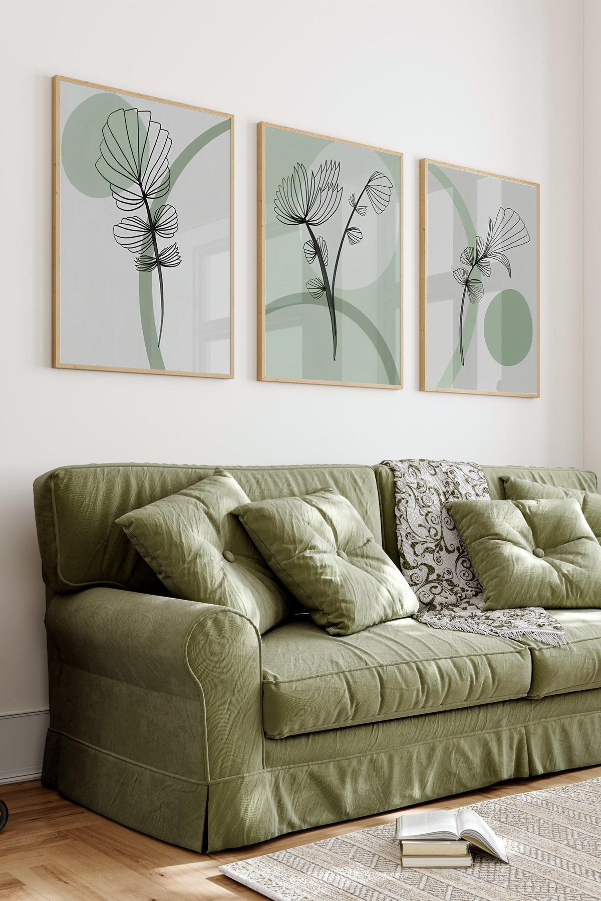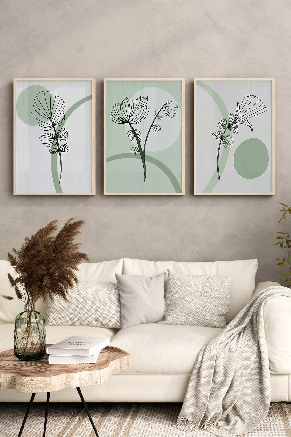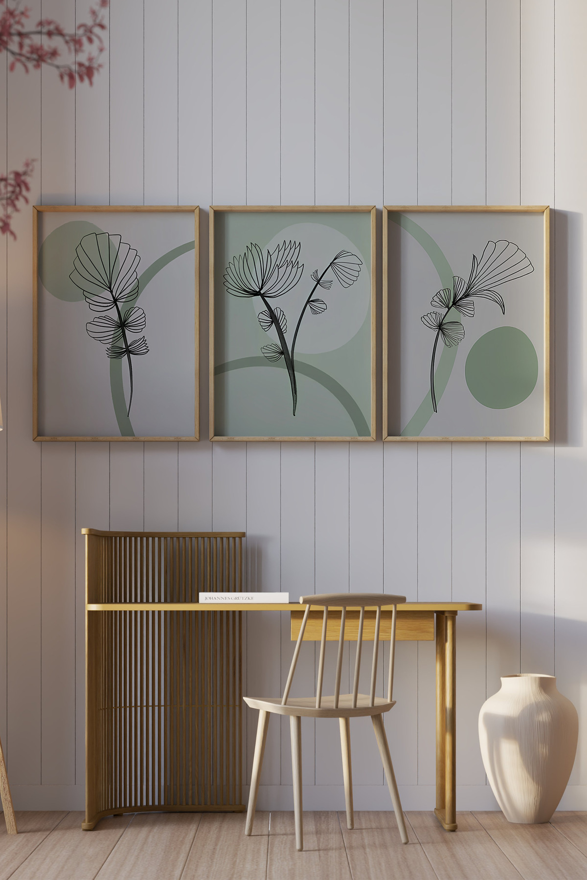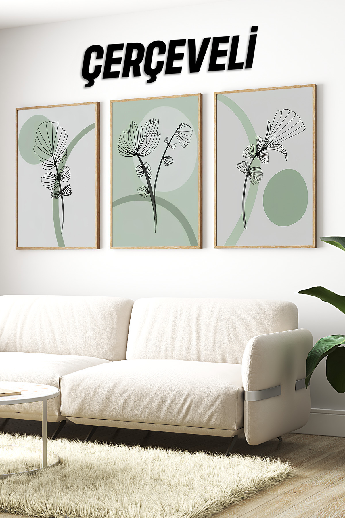 3’lü Çerçeveli Yeşil Tonlarda Minimal Çizgisel Bitki Tablo Seti –UV Baskılı, MDF Zeminli 🖼️ CRV1031