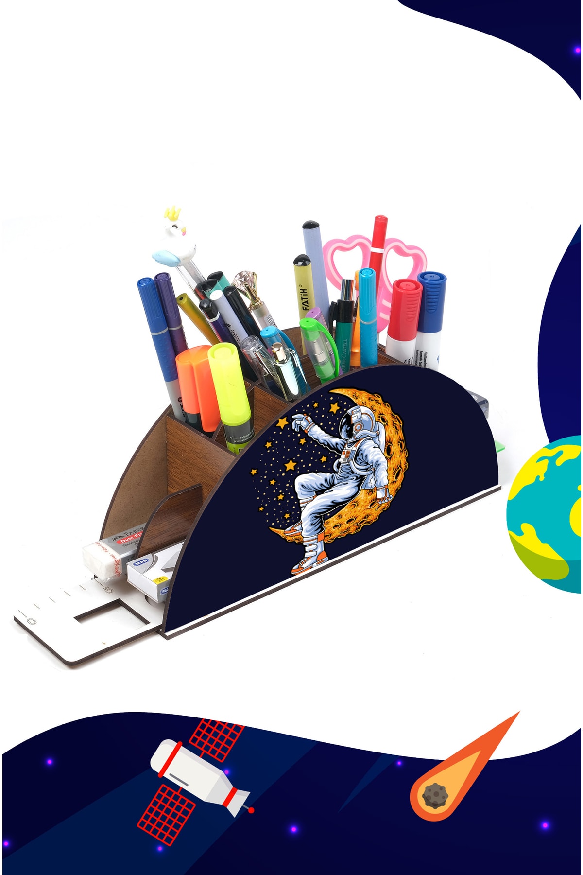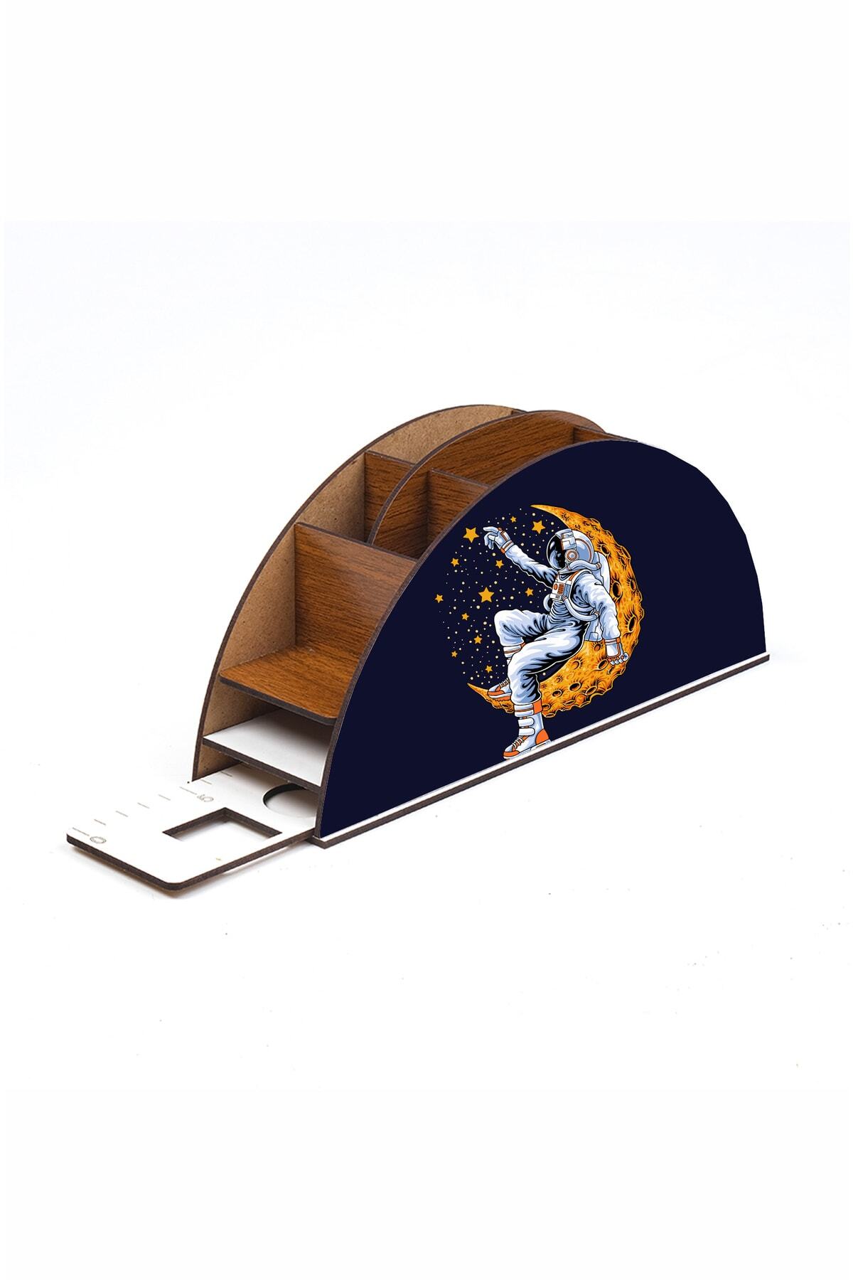 Ahşap Ay Ve Astronot Gökkuşağı Cetvelli Masaüstü Kalemlik Kutu Çocuklar Için Organizer Gk16