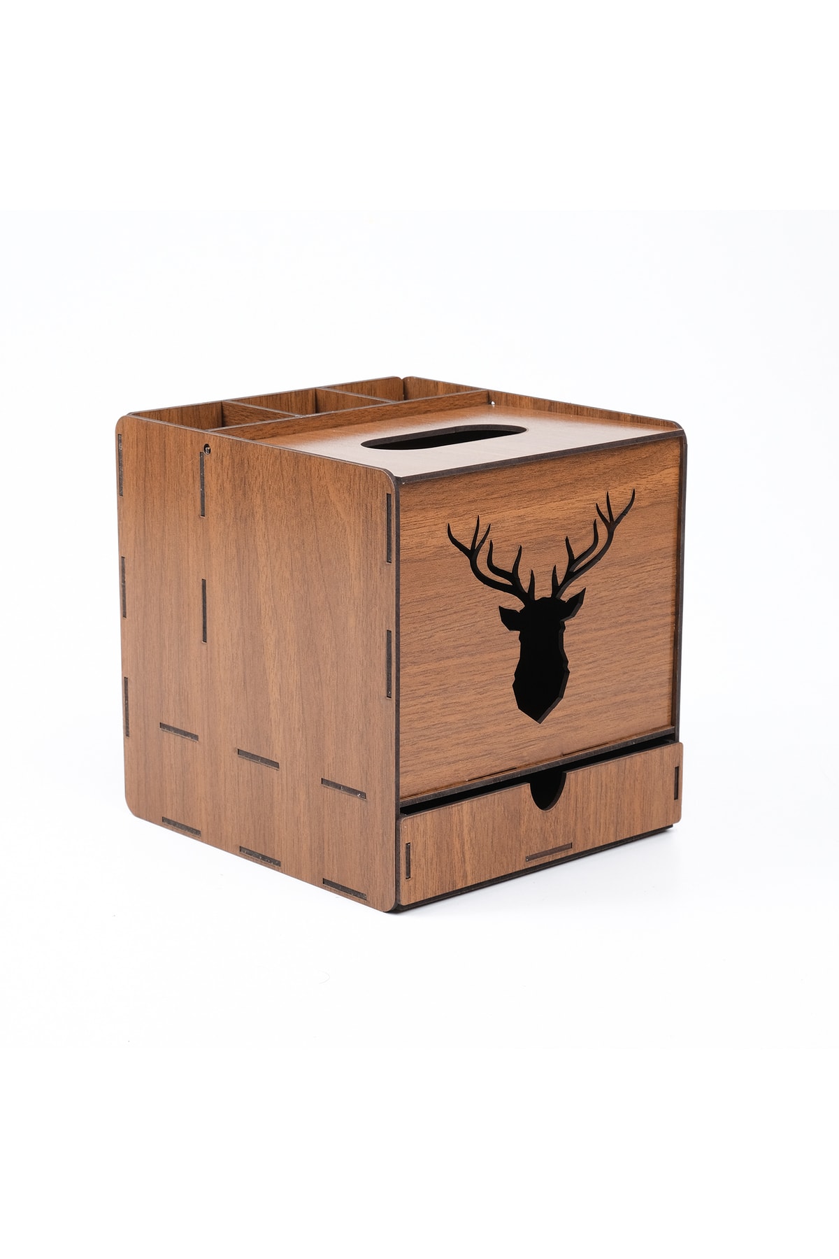 Ahşap Masaüstü Organizer Kalemlik Peçetelik Kare Geyikli Montajı Yapılmış (ceviz)