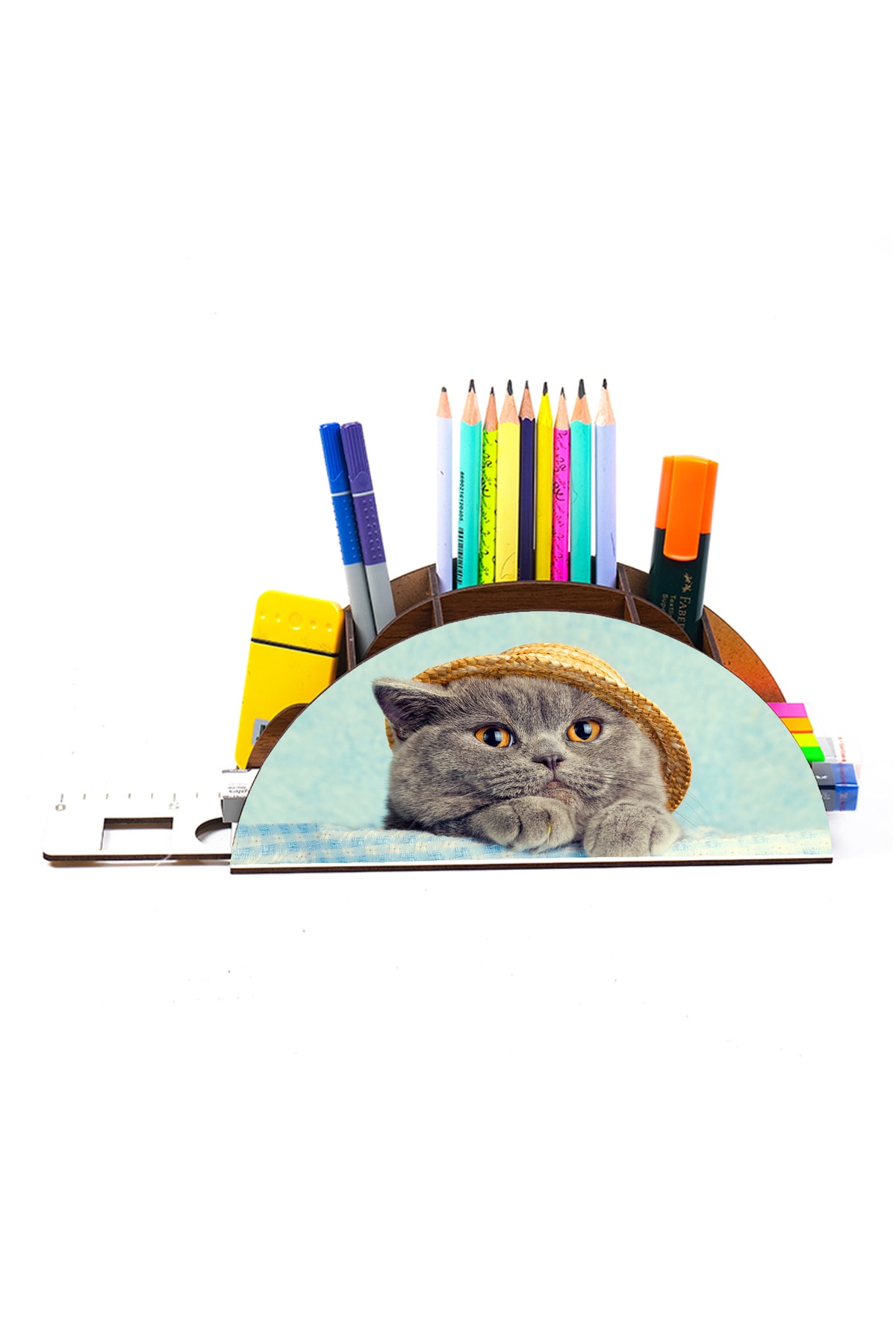 Ahşap Şapkalı Kedi Gökkuşağı Cetvelli Masaüstü Kalemlik Kutu Çocuklar Için Organizer Gk124
