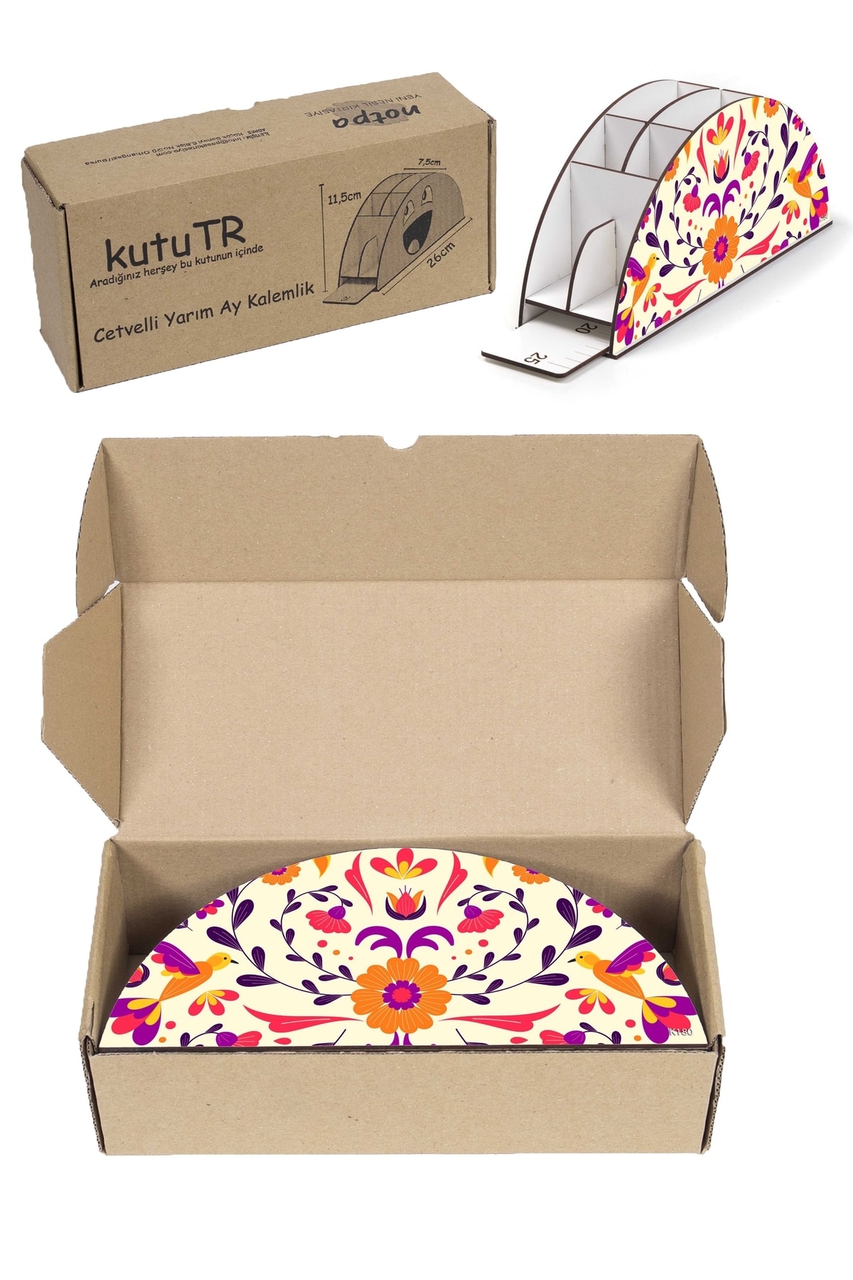 Ahşap Vip Çiçek Serisi Gökkuşağı Cetvelli Masaüstü Kalemlik Organizer Montajlı Kutulu