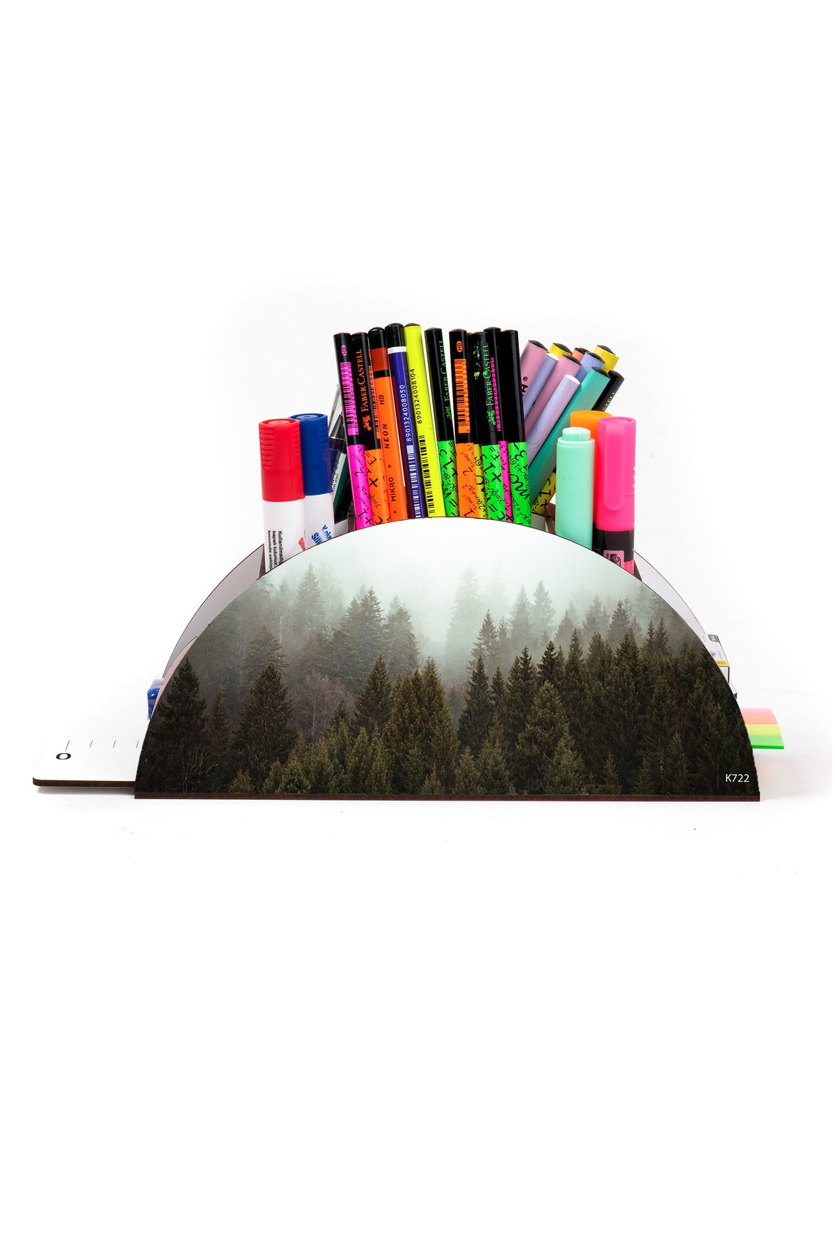 Ahşap Vip Dağ Serisi Gökkuşağı Cetvelli Masaüstü Kalemlik Organizer Montajlı Kutulu