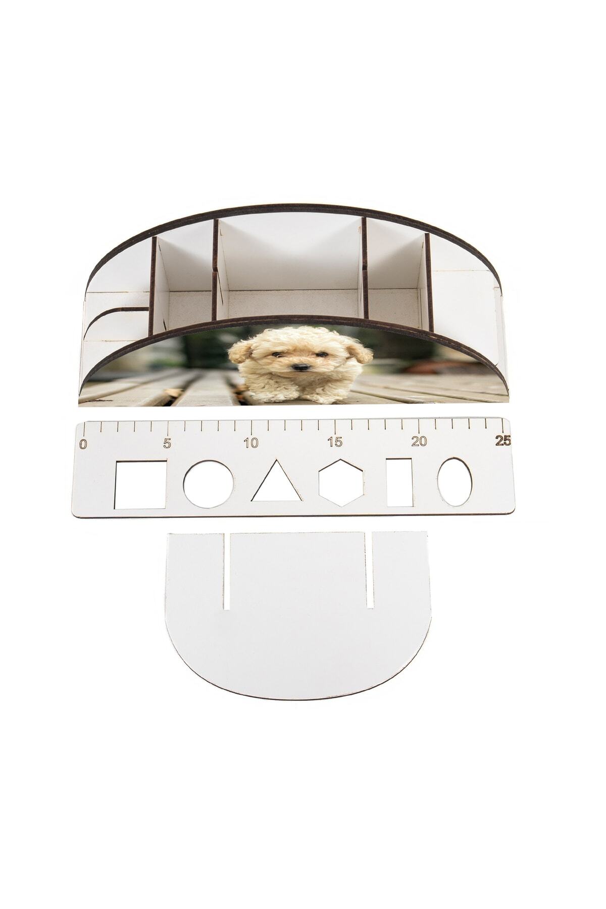 Ahşap Vip Köpek Serisi Gökkuşağı Cetvelli Masaüstü Kalemlik Organizer Montajlı Kutulu