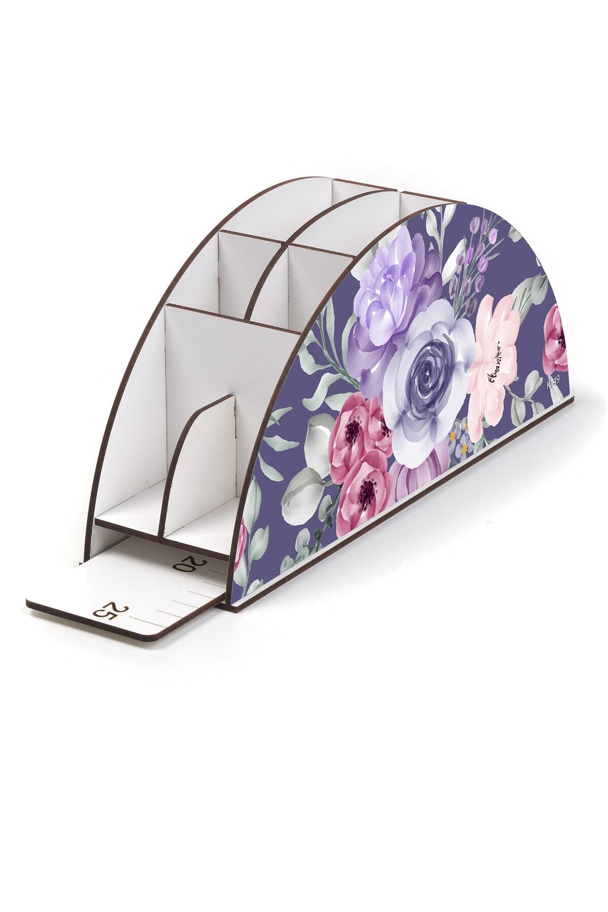 Ahşap Vip Mor Gül Desenli Gökkuşağı Cetvelli Masaüstü Kalemlik Organizer Vip149