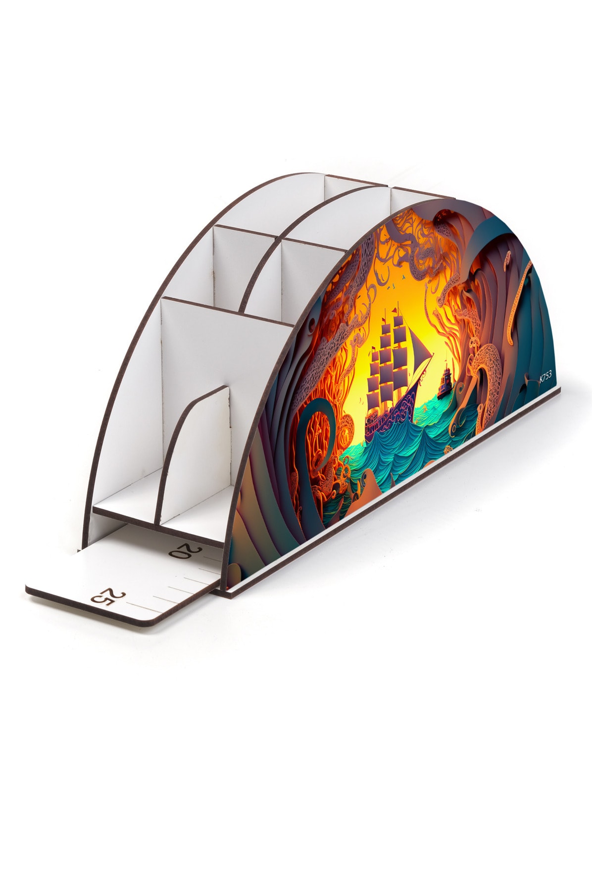 Ahşap VİP Okyanus Serisi Gökkuşağı Cetvelli Masaüstü Kalemlik Organizer Montajlı Kutulu