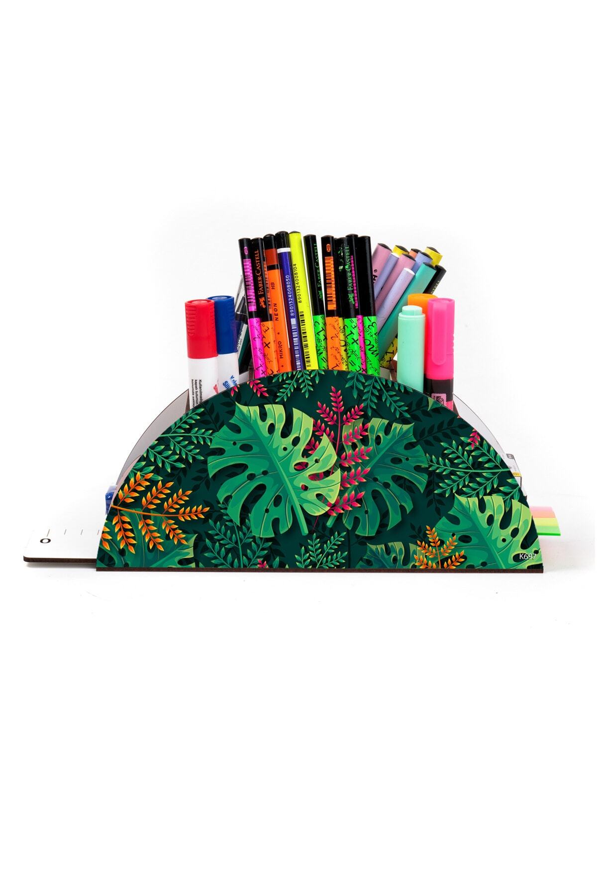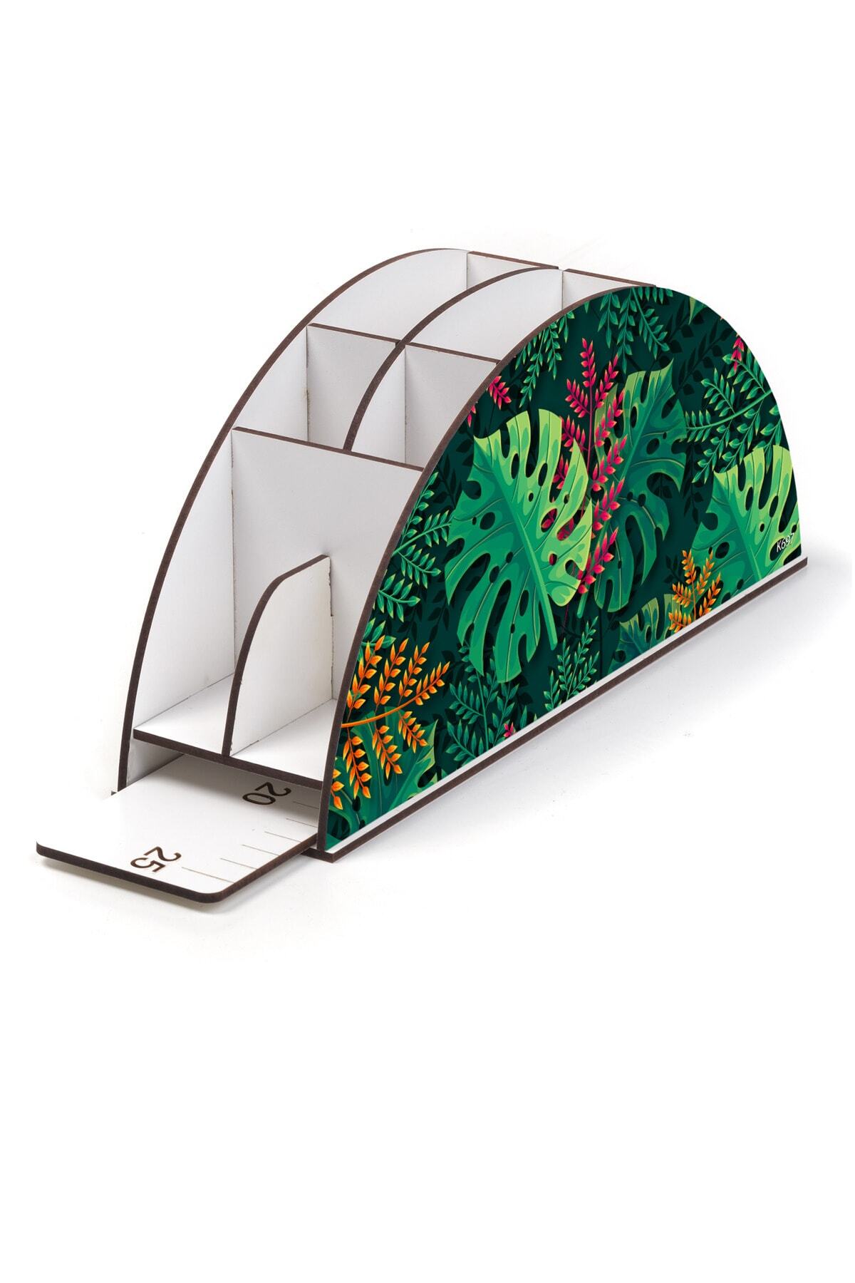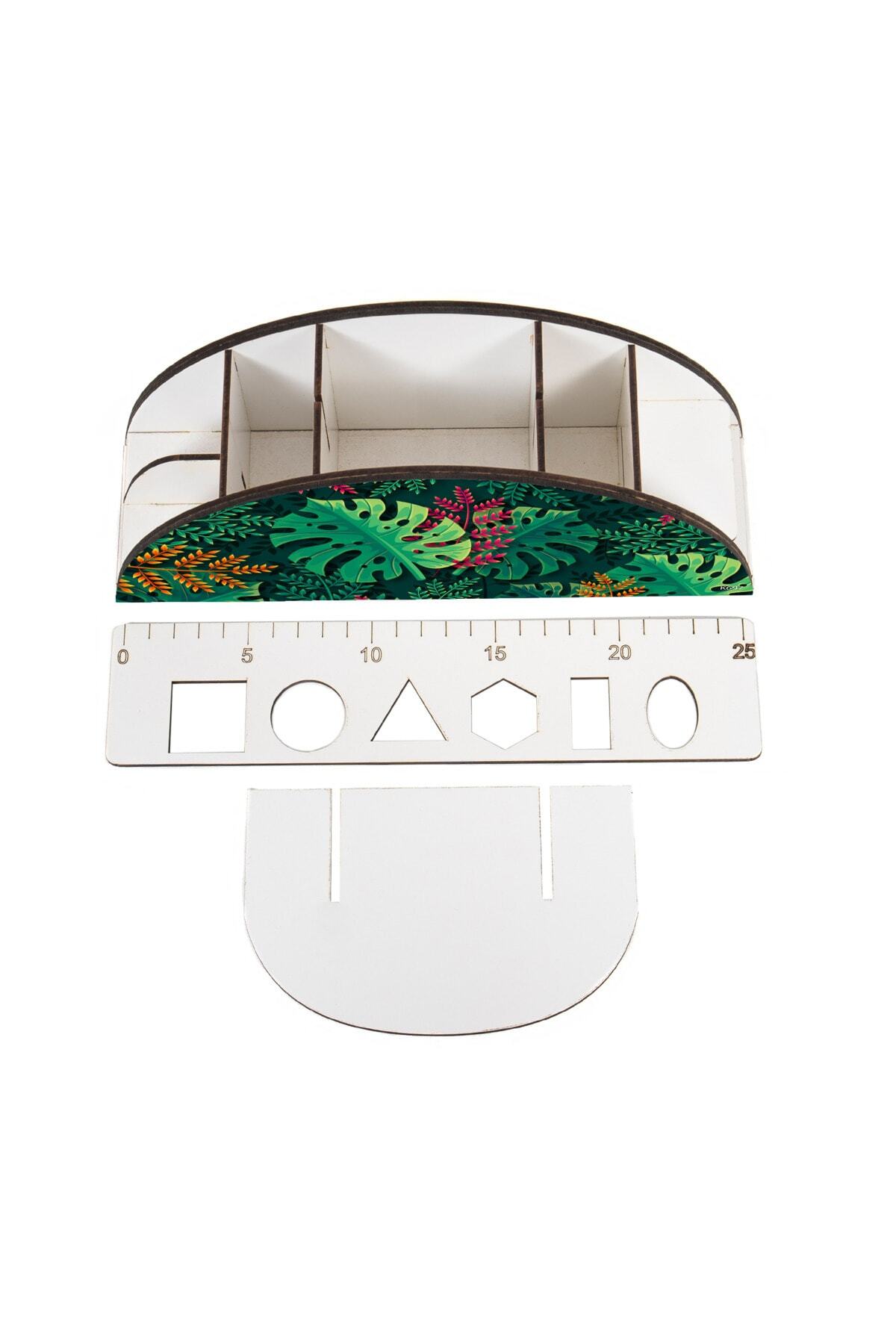 Ahşap VİP Orman ve Yapraklar Serisi Gökkuşağı Cetvelli Masaüstü Kalemlik Organizer Montajlı Kutulu