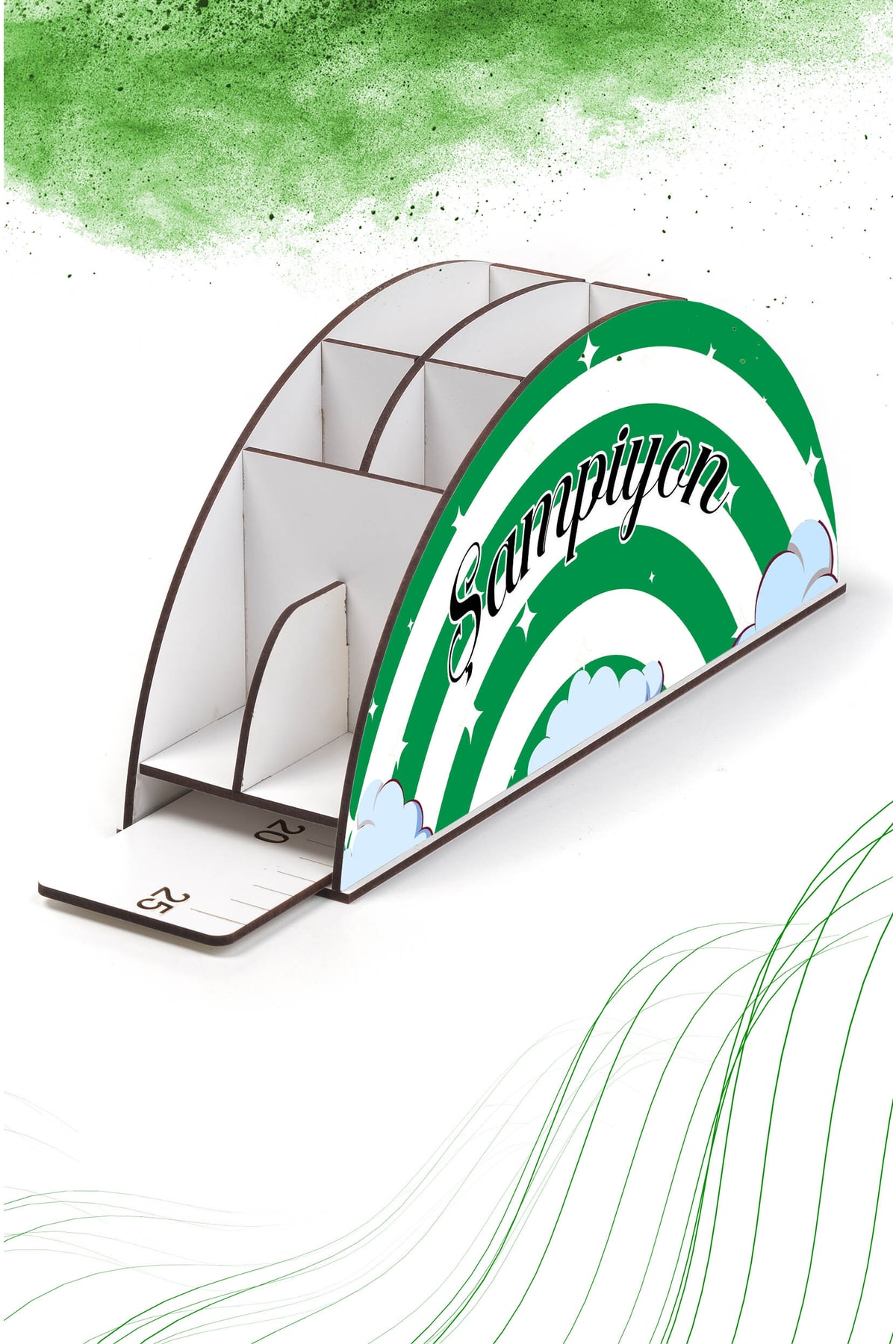 Ahşap Vip Spor Serisi Gökkuşağı Cetvelli Masaüstü Kalemlik Organizer Montajlı Kutulu