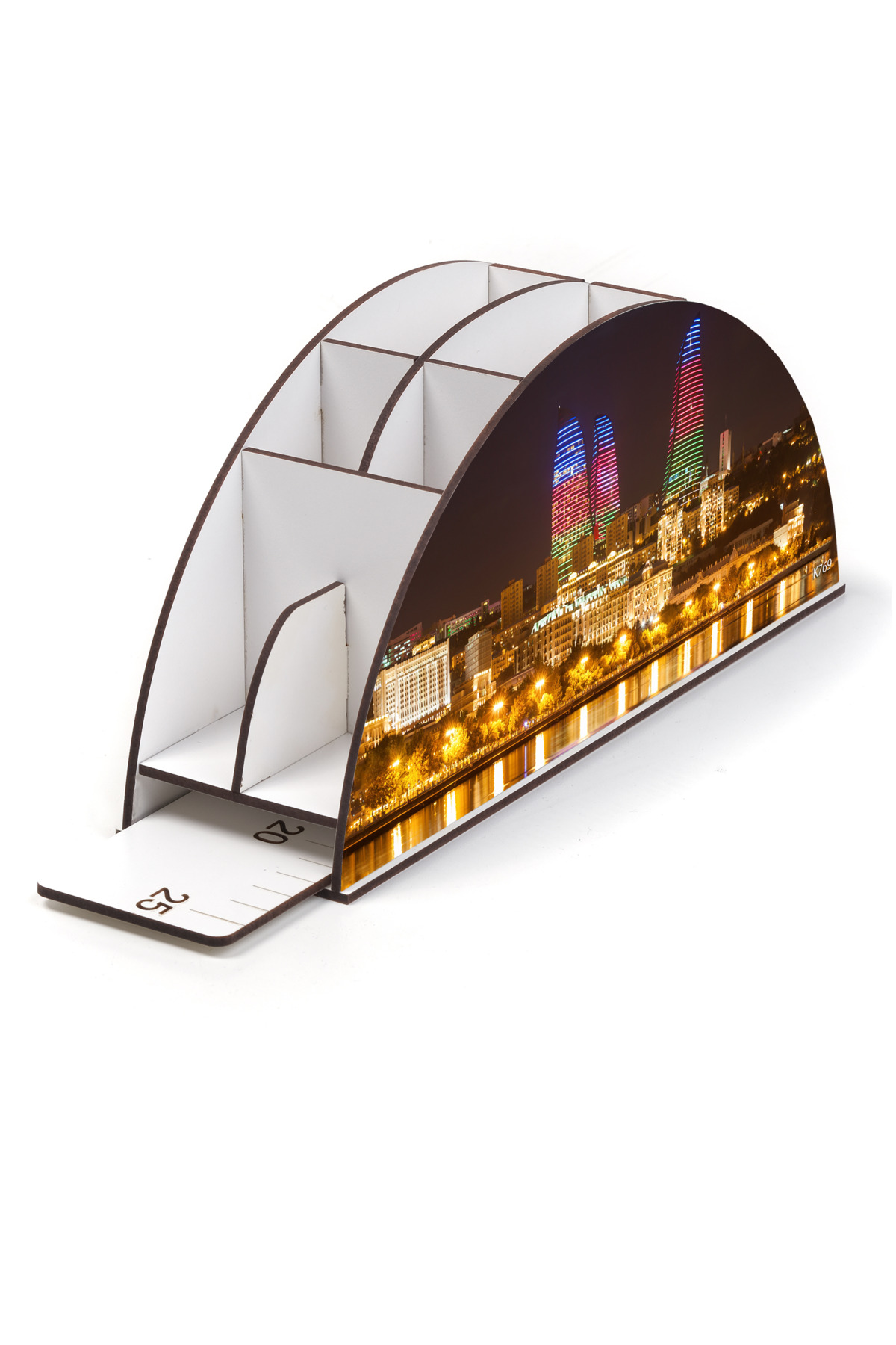 Ahşap VİP Türkiye-Azerbaycan Serisi Gökkuşağı Cetvelli Masaüstü Kalemlik Organizer Montajlı Kutulu