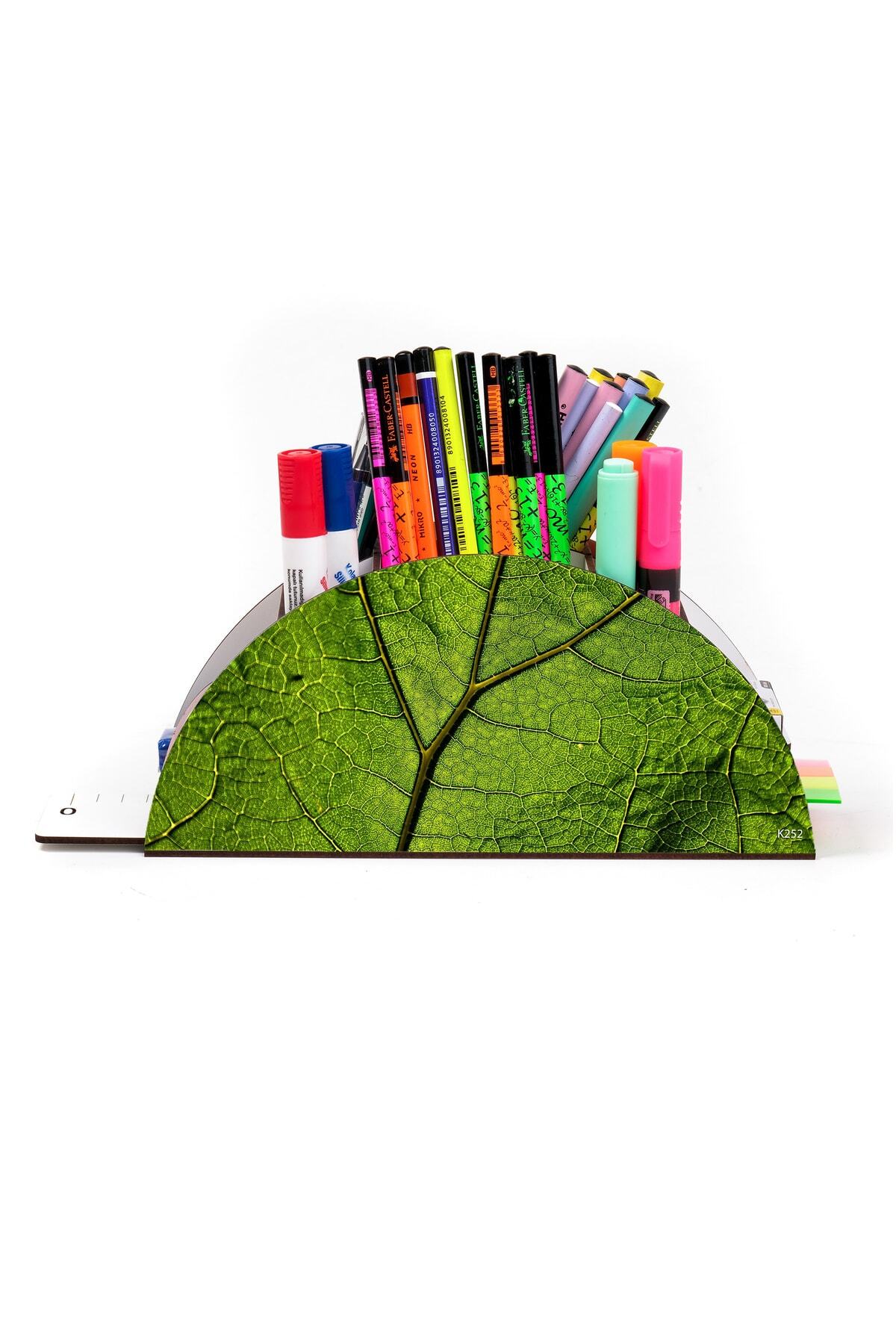 Ahşap Vip Yaprak Serisi Gökkuşağı Cetvelli Masaüstü Kalemlik Organizer Montajlı Kutulu