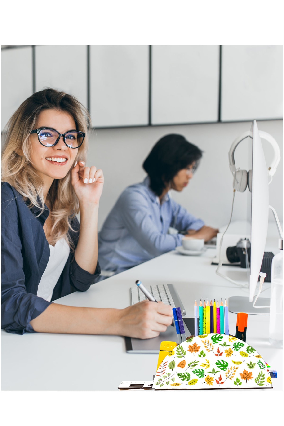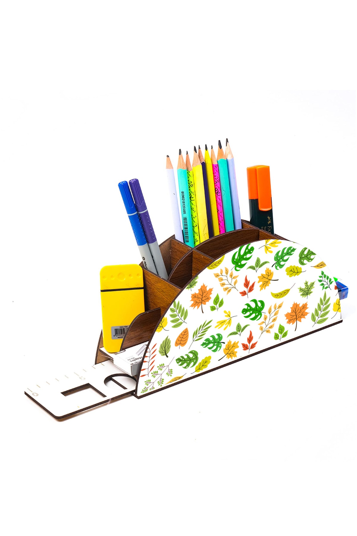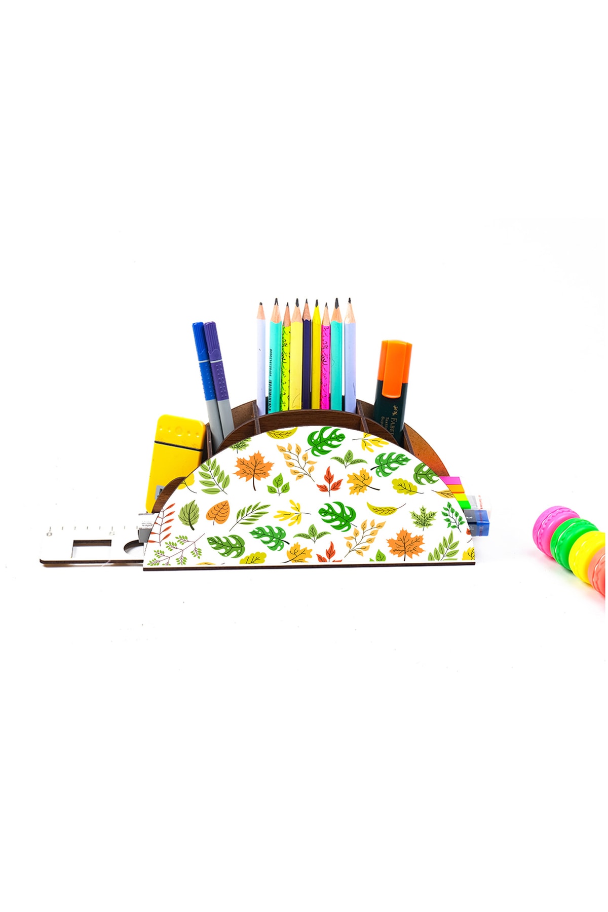 Ahşap Yapraklar Gökkuşağı Cetvelli Masaüstü Kalemlik Kutu Çocuklar Için Organizer Gk46