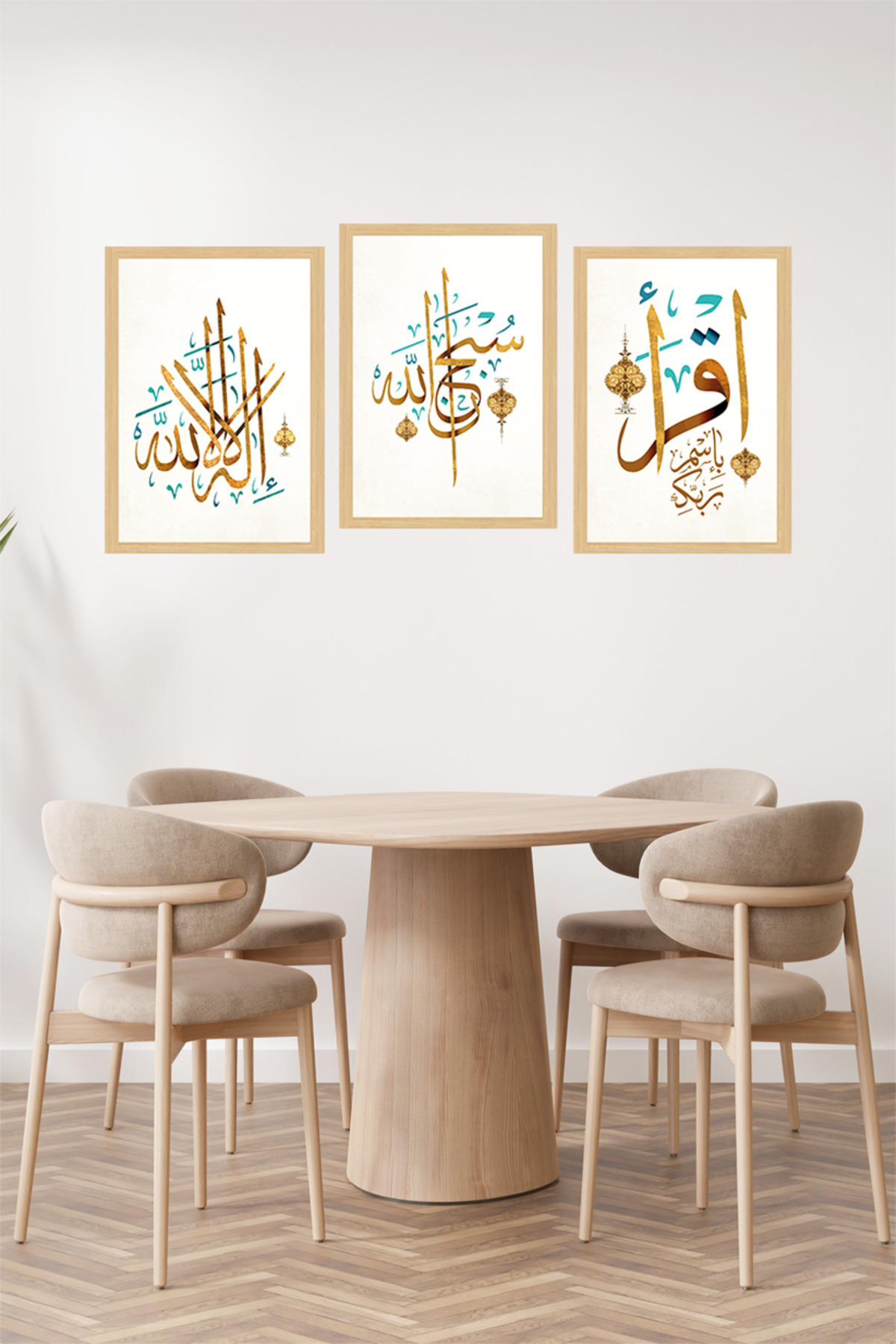 🌿 Allah Yazılı Altın ve Turkuaz Hat Sanatı 3’lü Çerçeve Görünümlü Tablo Seti 🌟 CRVS1084