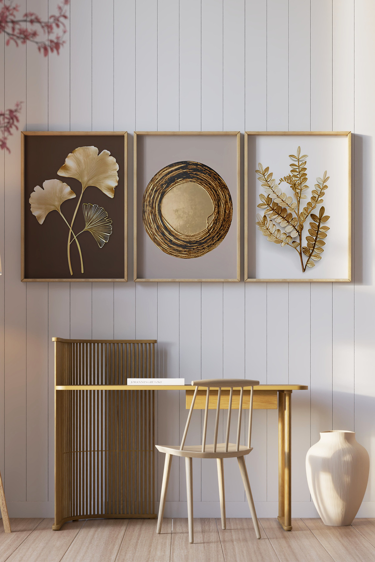 ✨ Altın Dokulu Doğa ve Geometrik Formlar – Çerçeveli 3’lü Tablo Seti🌿 CRV1132
