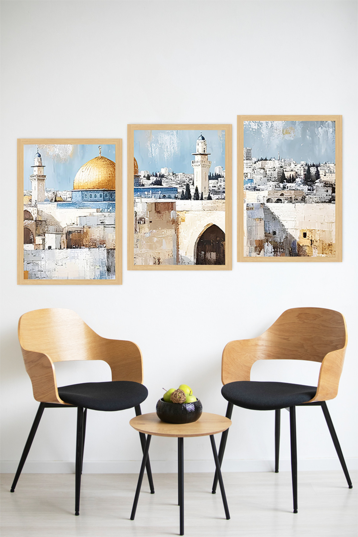 Altın Kubbe ve Kudüs Manzaralı 3’lü Tablo Seti 🕌✨ Kudüs’ün Ruhunu Evinize Taşıyın!🌙 CRVS1239