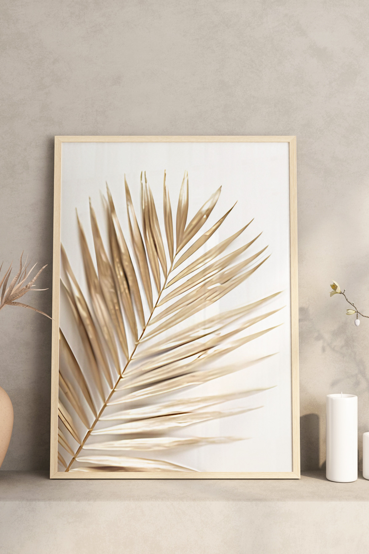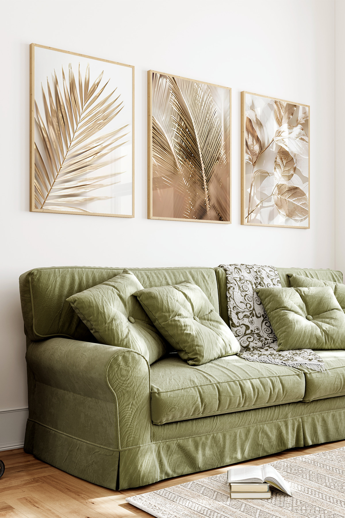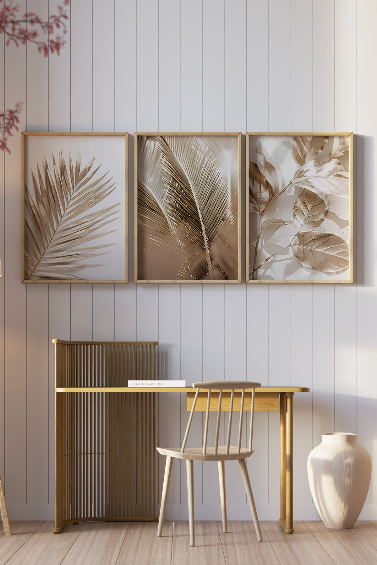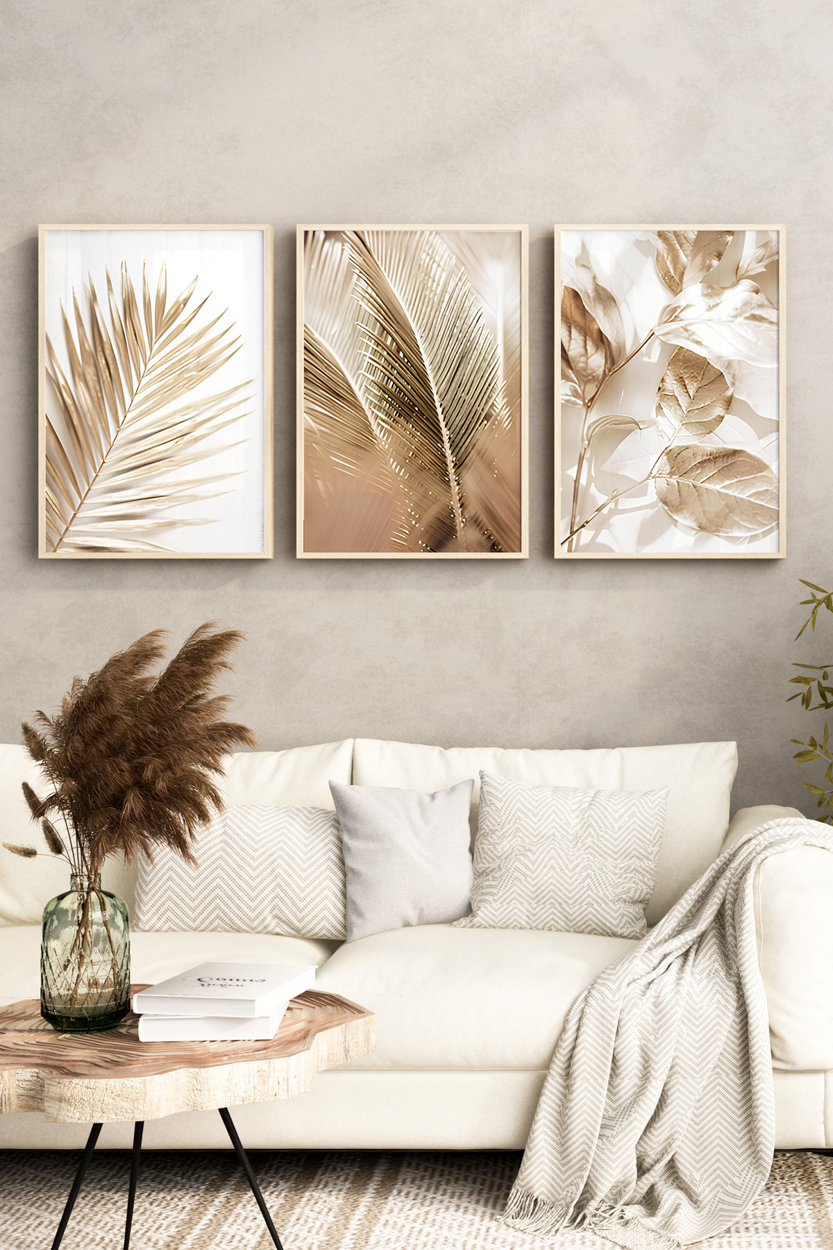 🌿 Altın Tonlarda Tropikal Yaprak Temalı 3’lü Çerçeveli Tablo Seti🌿 CRV1142
