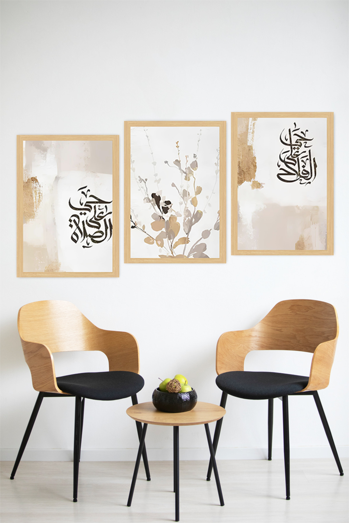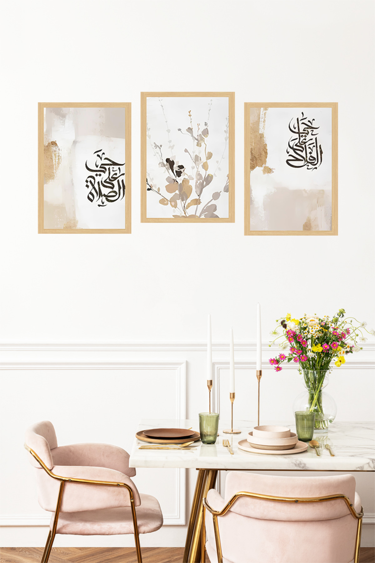 🌿 Bej ve Altın Tonlarında Hat Yazılı ve Bitki Desenli 3'lü Tablo Seti🌟 CRVS1113