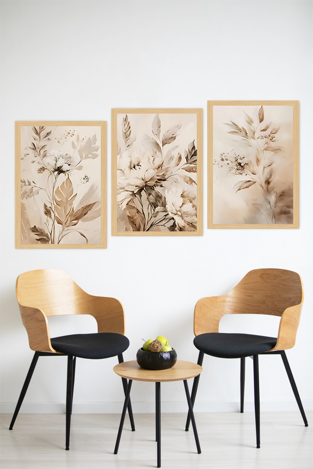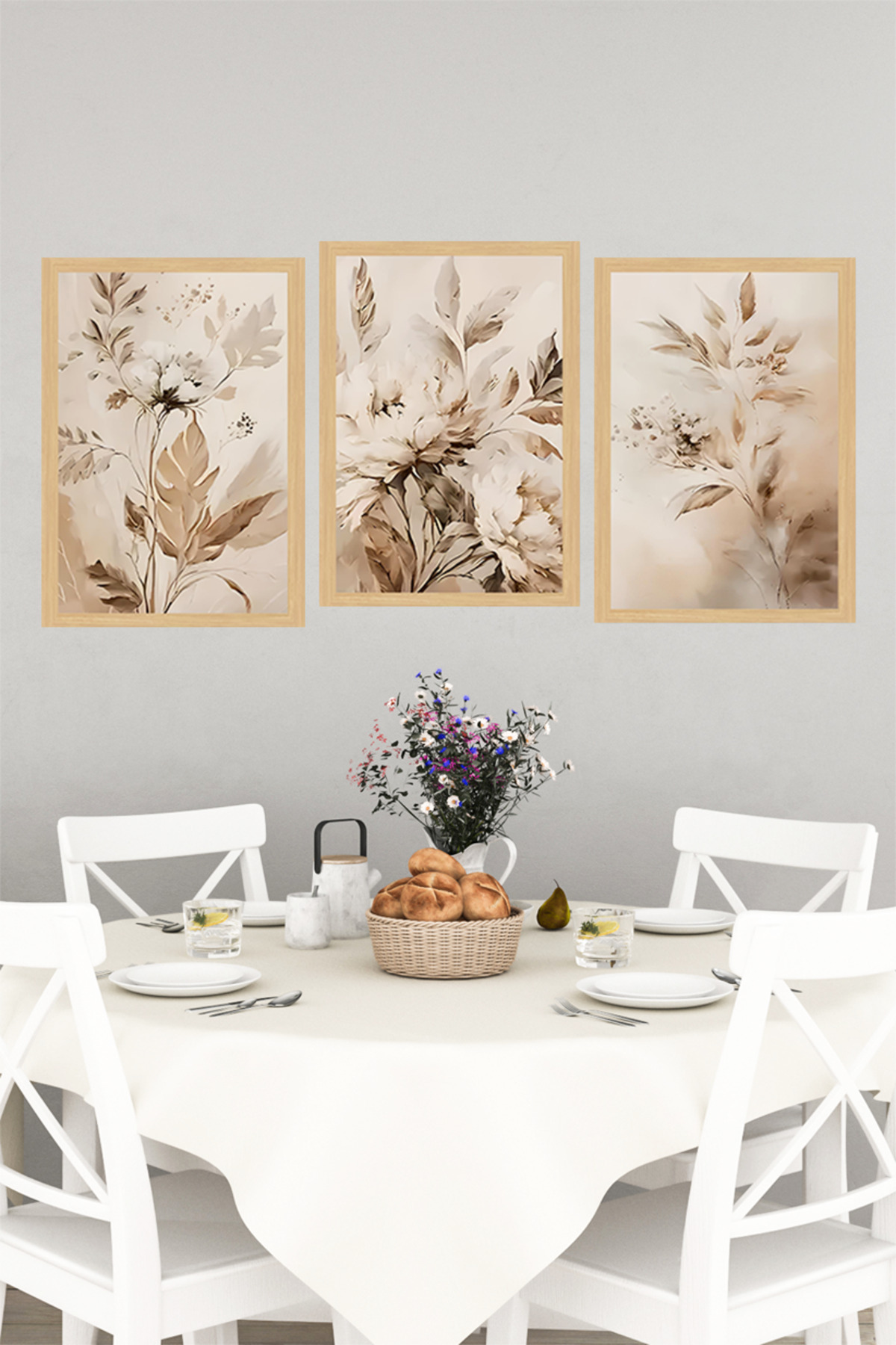 🌿 Bej ve Toprak Tonlarında Suluboya Çiçekler – 3’lü Çerçeve Görünümlü Tablo Seti🌟 CRVS1119