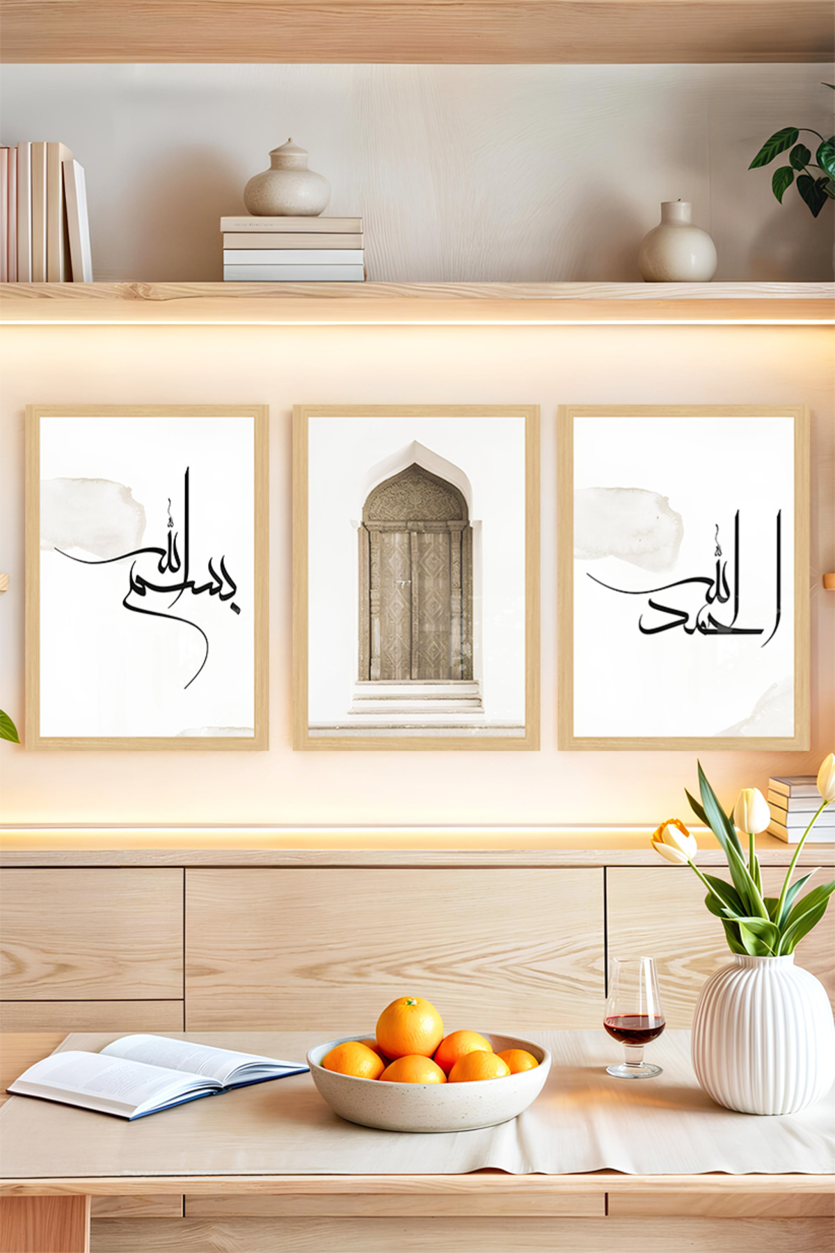 🕌 Bismillah ve Elhamdülillah Yazılı İslami Kapı Temalı 3’lü Tablo Seti – Çerçeve Görünümlü CRVS1199