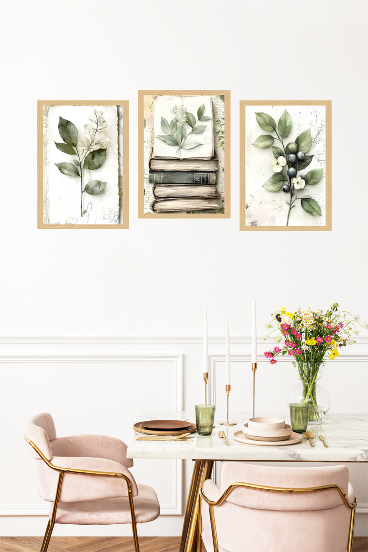 🌿 Bitki ve Kitap Temalı Çerçeve Görünümlü 3'lü Tablo Seti 🌿🌟 CRVS1095