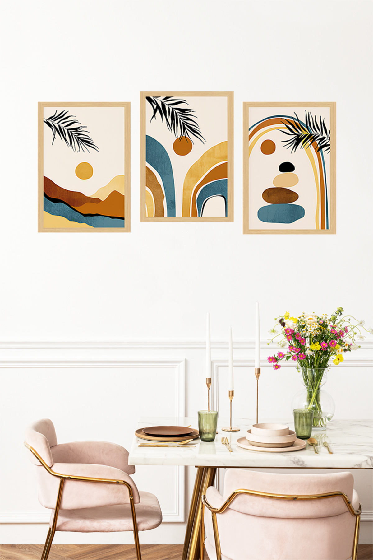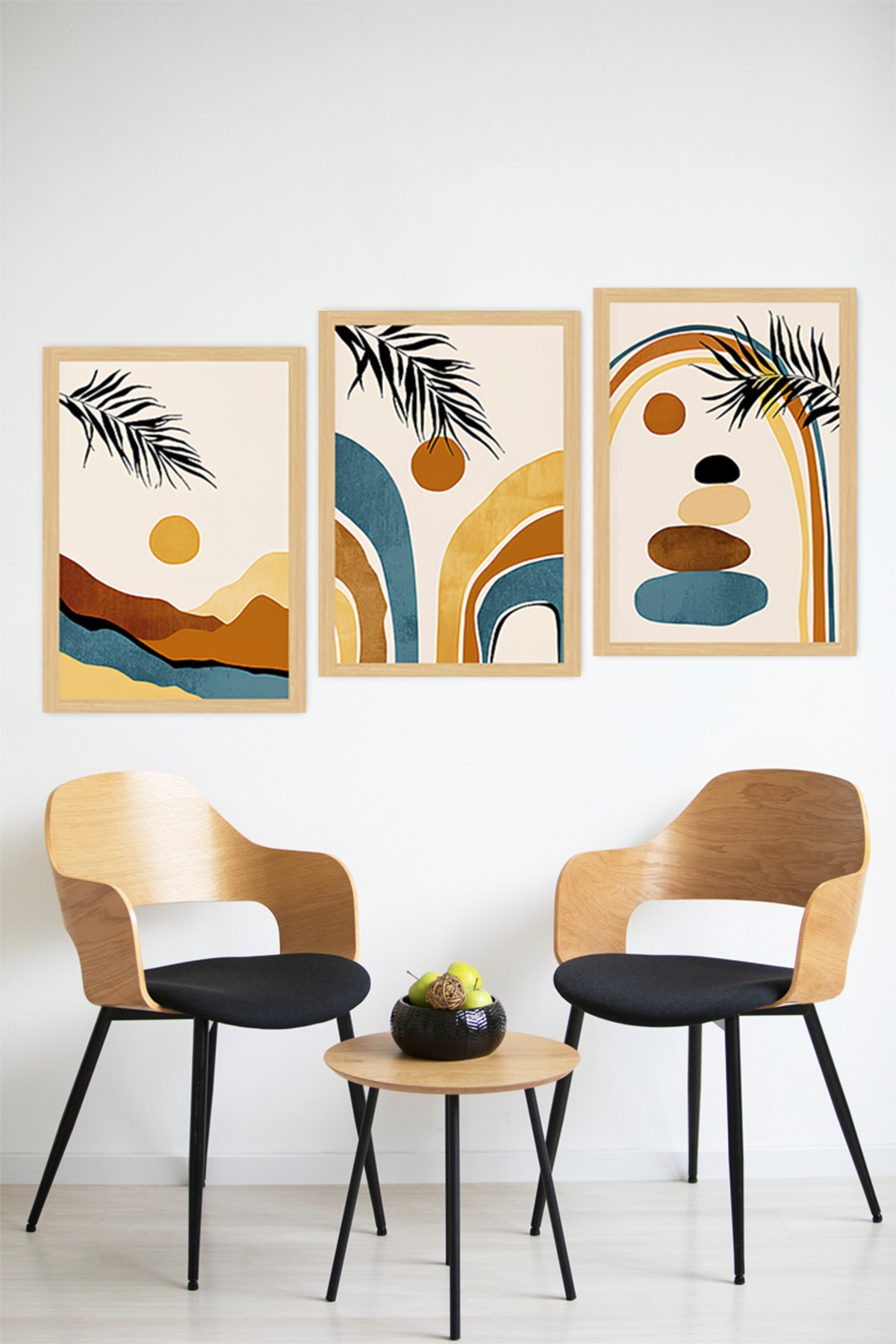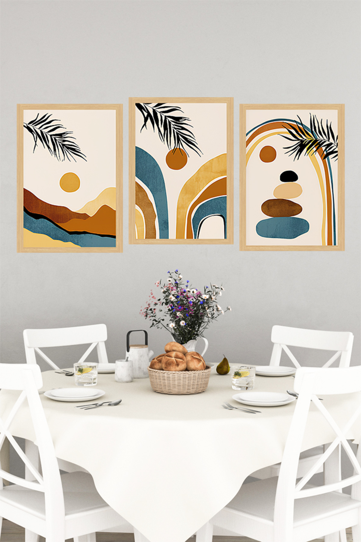 🌿 Bohem Renklerde Palmiye ve Soyut Manzara Temalı 3’lü Çerçeve Görünümlü Tablo Seti🌟 CRVS1177