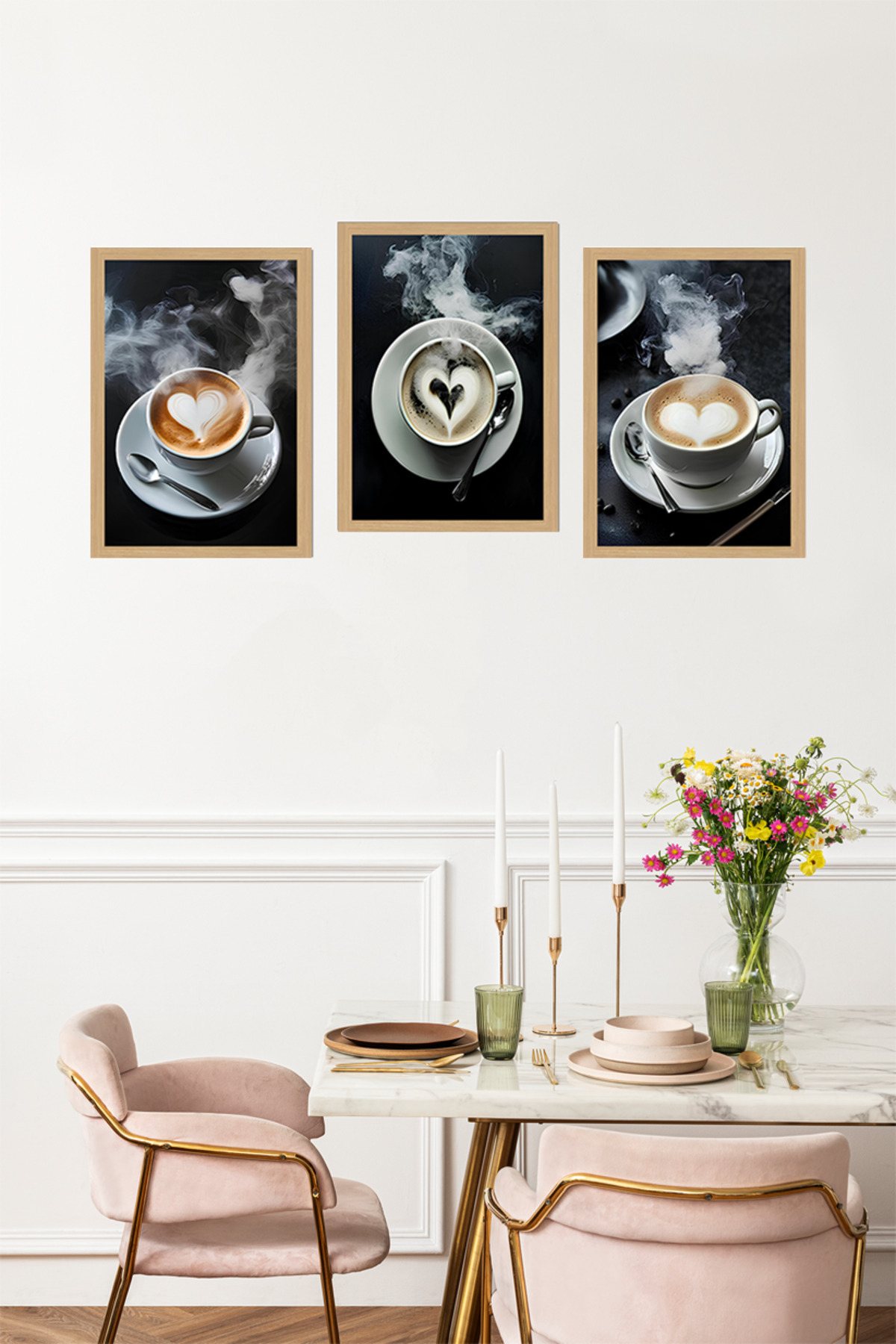 🖼️ Çerçeve Görünümlü 3'lü Tablo Seti – Kahve Köpüğü & Kalp Temalı CRVS1012