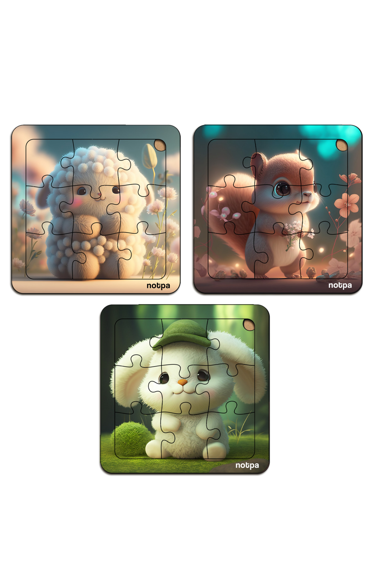 Çocuklar İçin Sevimli Hayvanlar Ahşap Renkli Yapboz 13x13 Ebadında Puzzle 9 Parça 3'lü Set 311