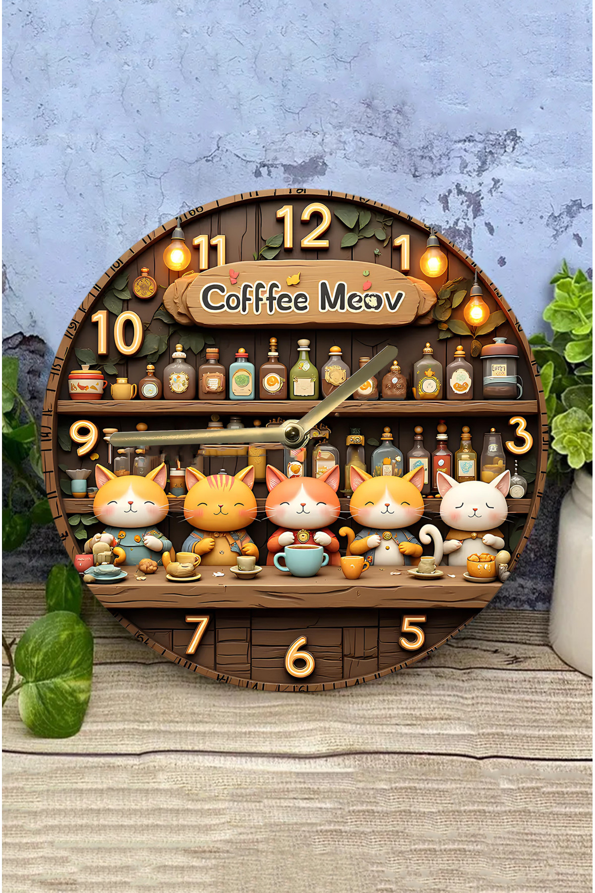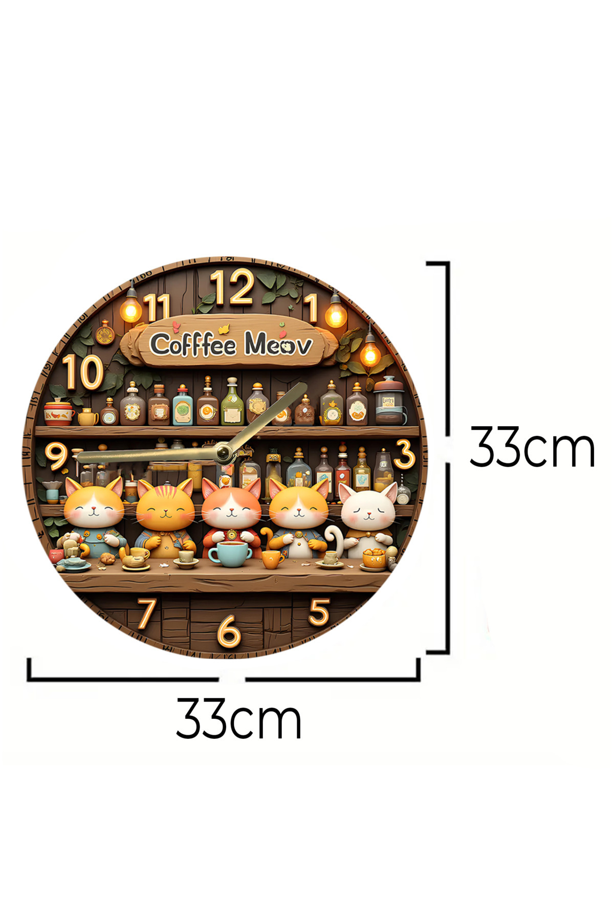 🐾 Coffee Meow Temalı Ahşap MDF Duvar Saati – 33 cm 3D Görünümlü 2D HD Baskı | Çift Katmanlı Sdw360