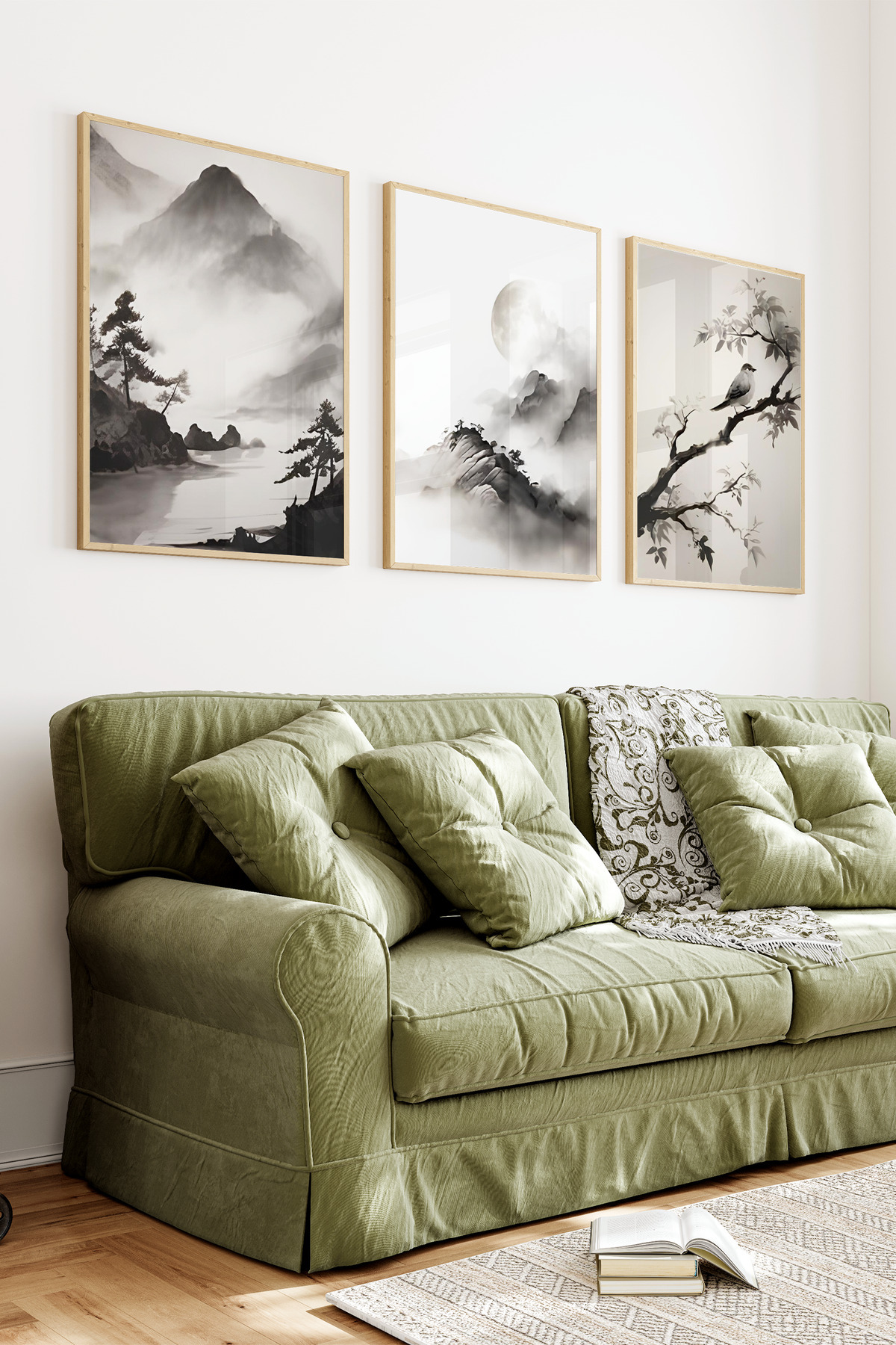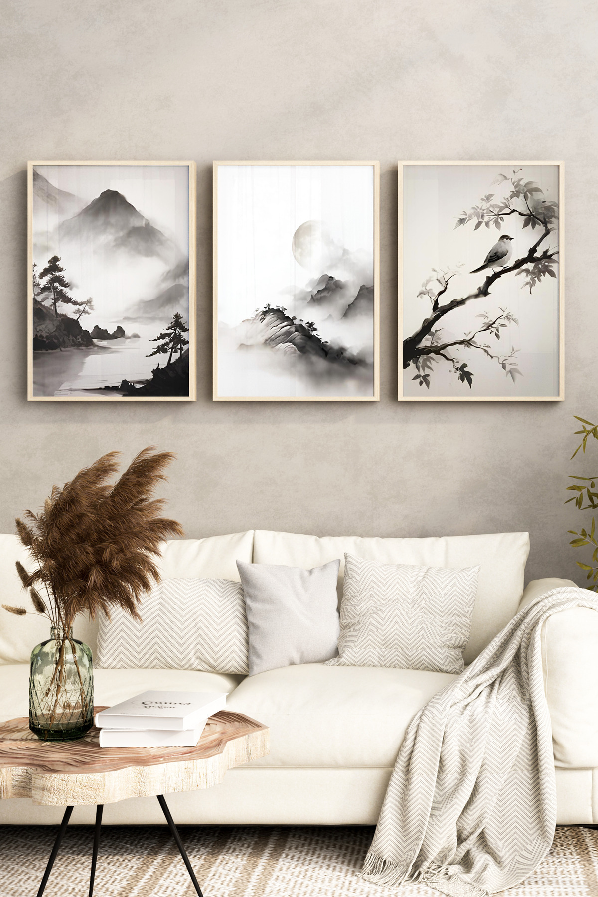 🌿 Dağ Manzaralı Çin Mürekkep Stili 3’lü Çerçeveli Tablo Seti🌿 CRV1105