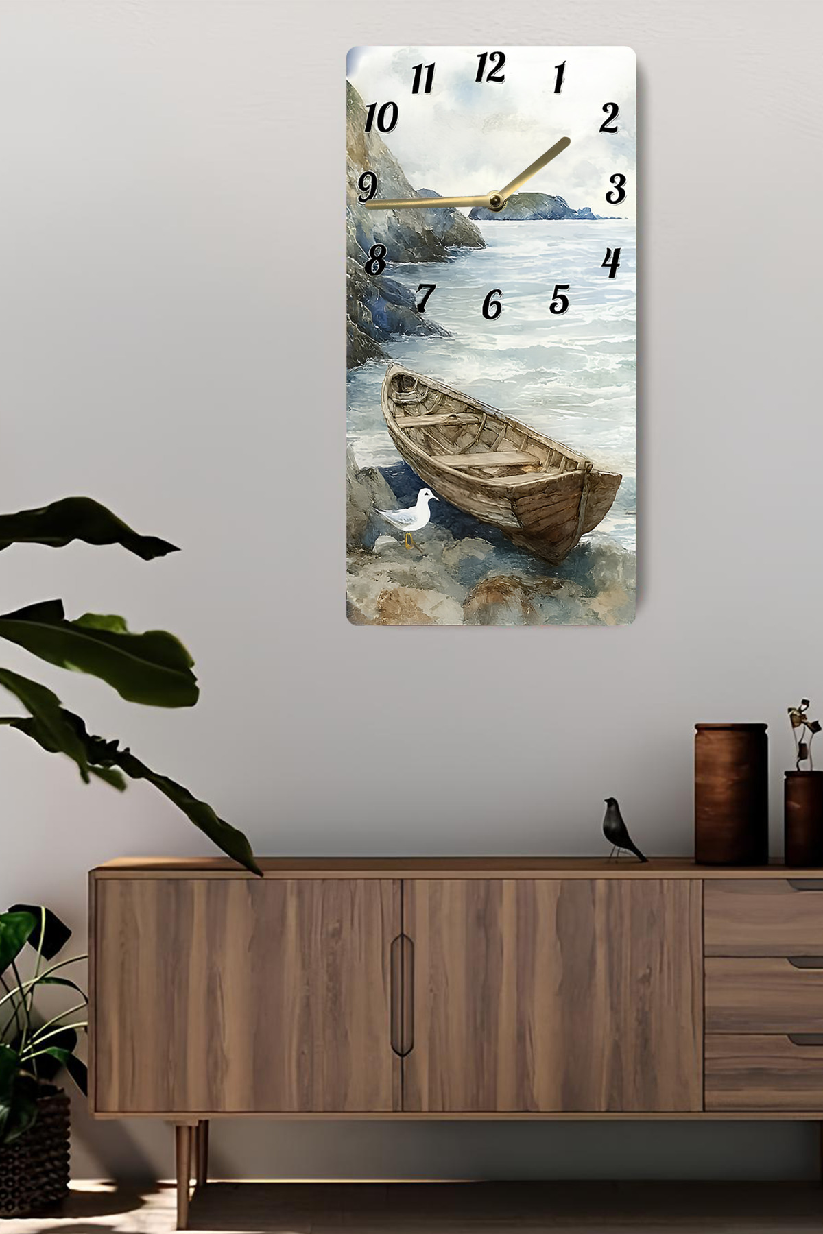 Dekoratif MDF Dikdörtgen Duvar Saati – Tekne ve Deniz Manzaralı Tasarım (30x60 cm)– USD036