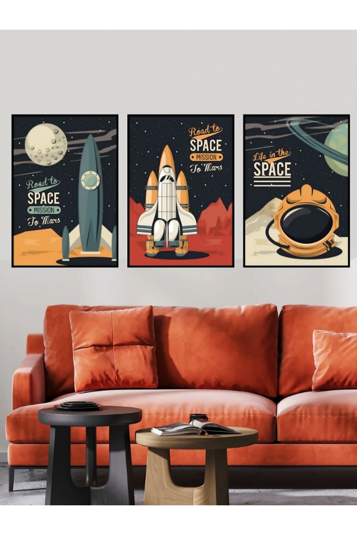 Dekorize Mdf Tablo Seti 3 Parça 3mm - Space Roket - Uzay Salon Oturma Odası Için Duvar Dekoru