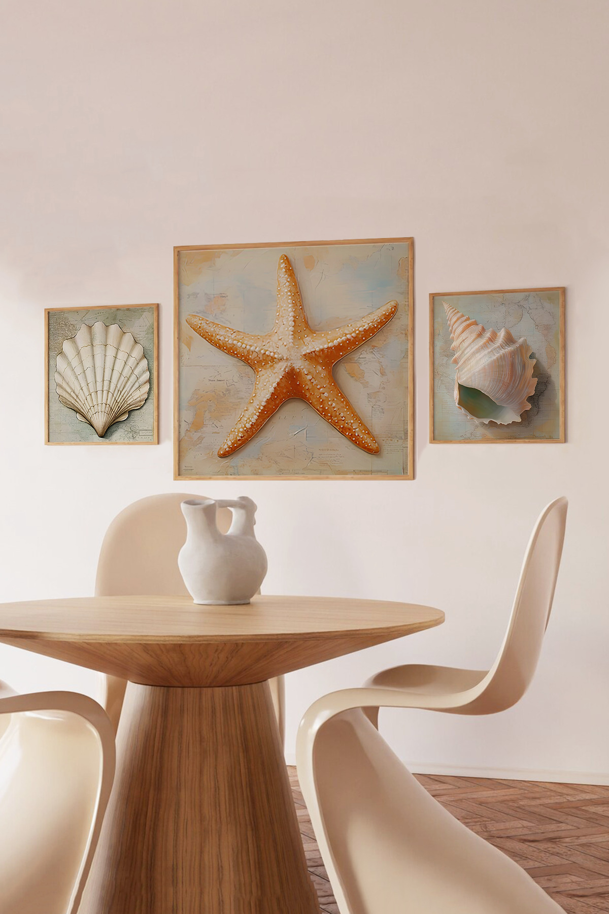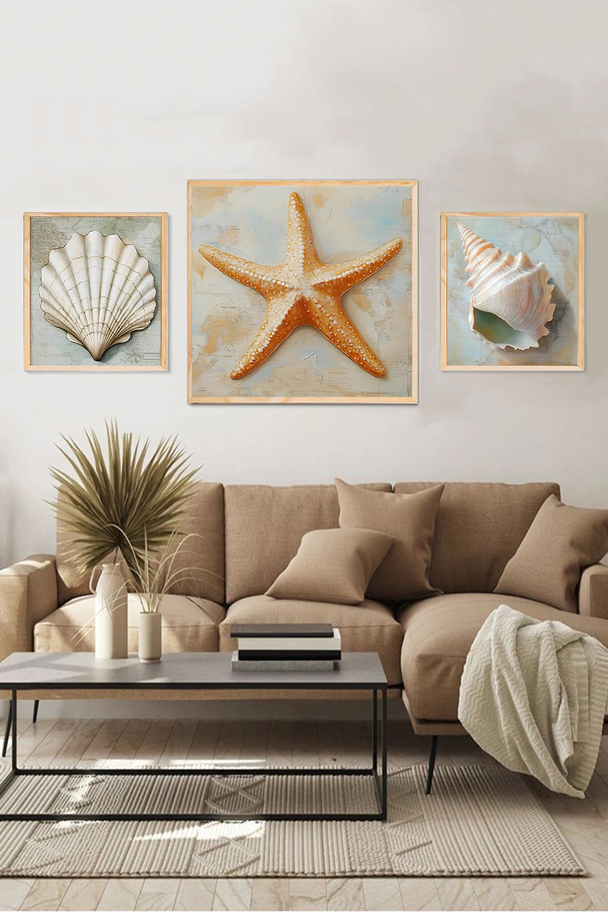 🌟 Deniz Yıldızı ve Kabuğu Temalı 3’lü Dekoratif Tablo Seti (23x23 cm & 42x42 cm) 4242115