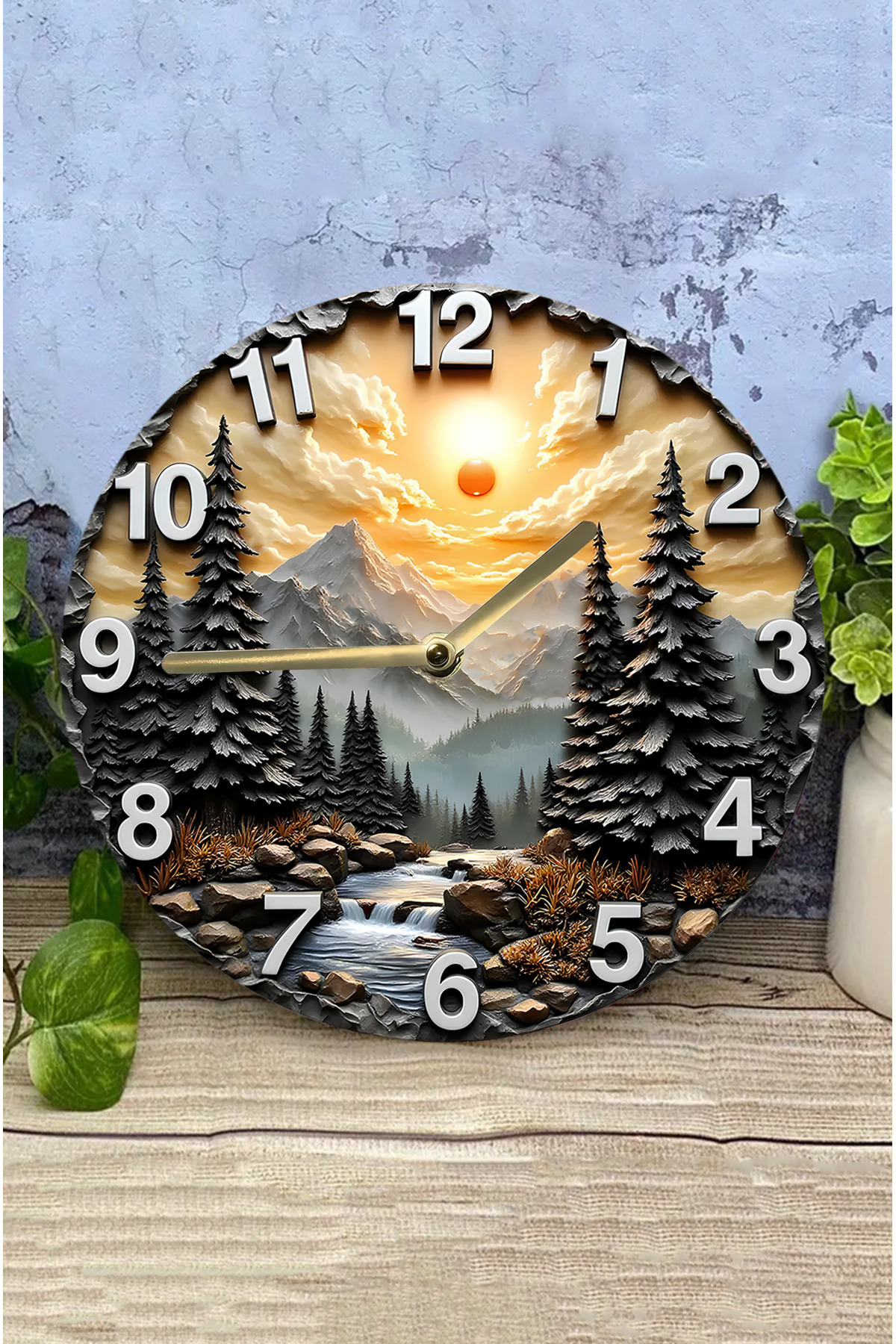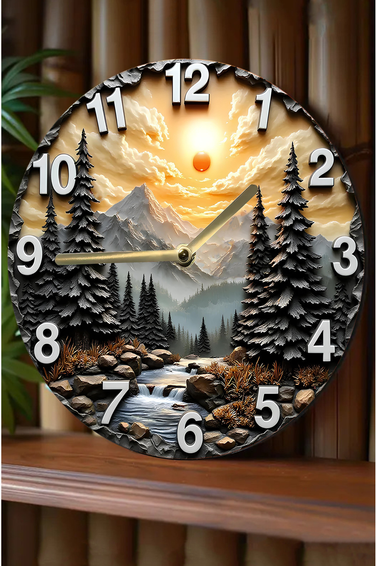 🌄 Doğa Temalı 3D Görünümlü MDF Duvar Saati – Gün Batımı ve Dağ Manzaralı sdw316