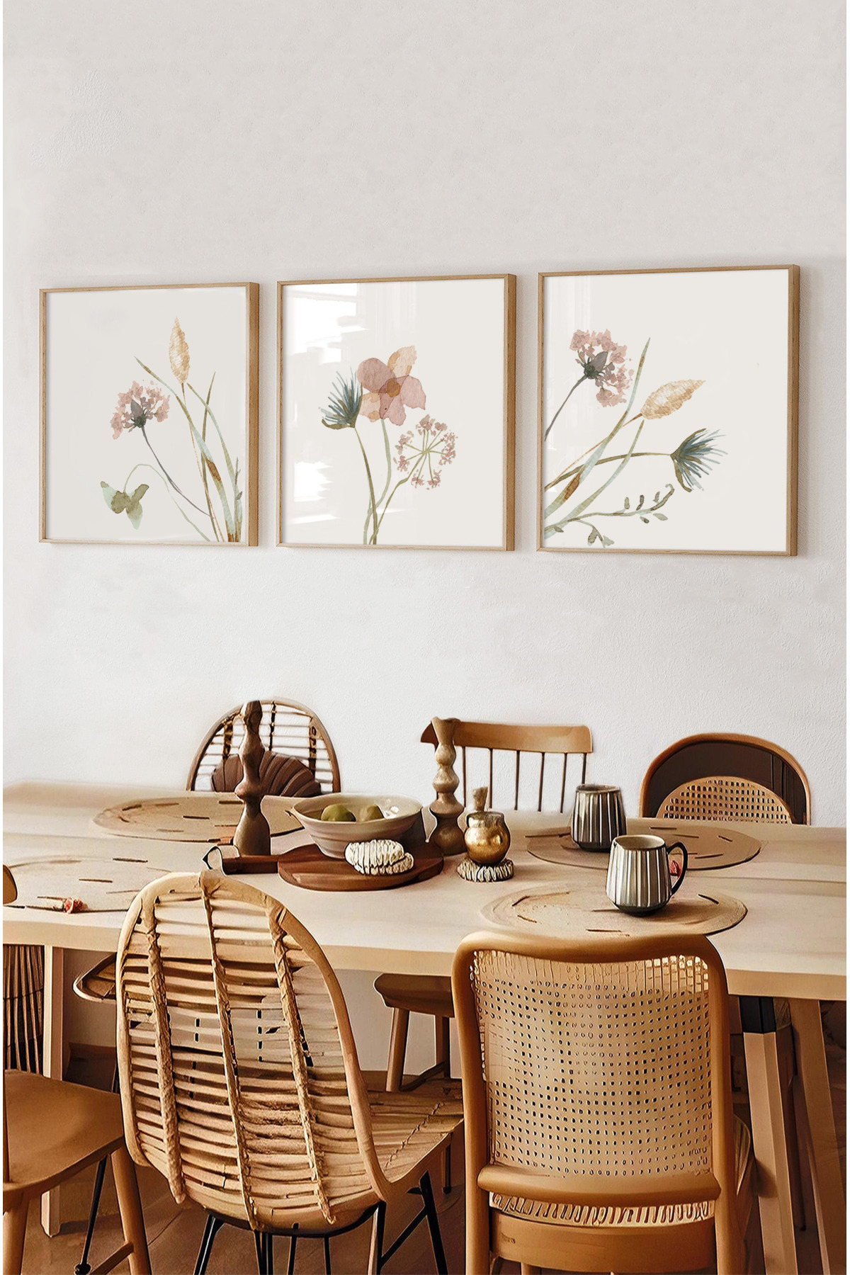 🌸 Doğal Çiçek Desenli 3’lü Tablo Seti | Çam Çerçeve MDF UV Baskı Varyantlı KR4042