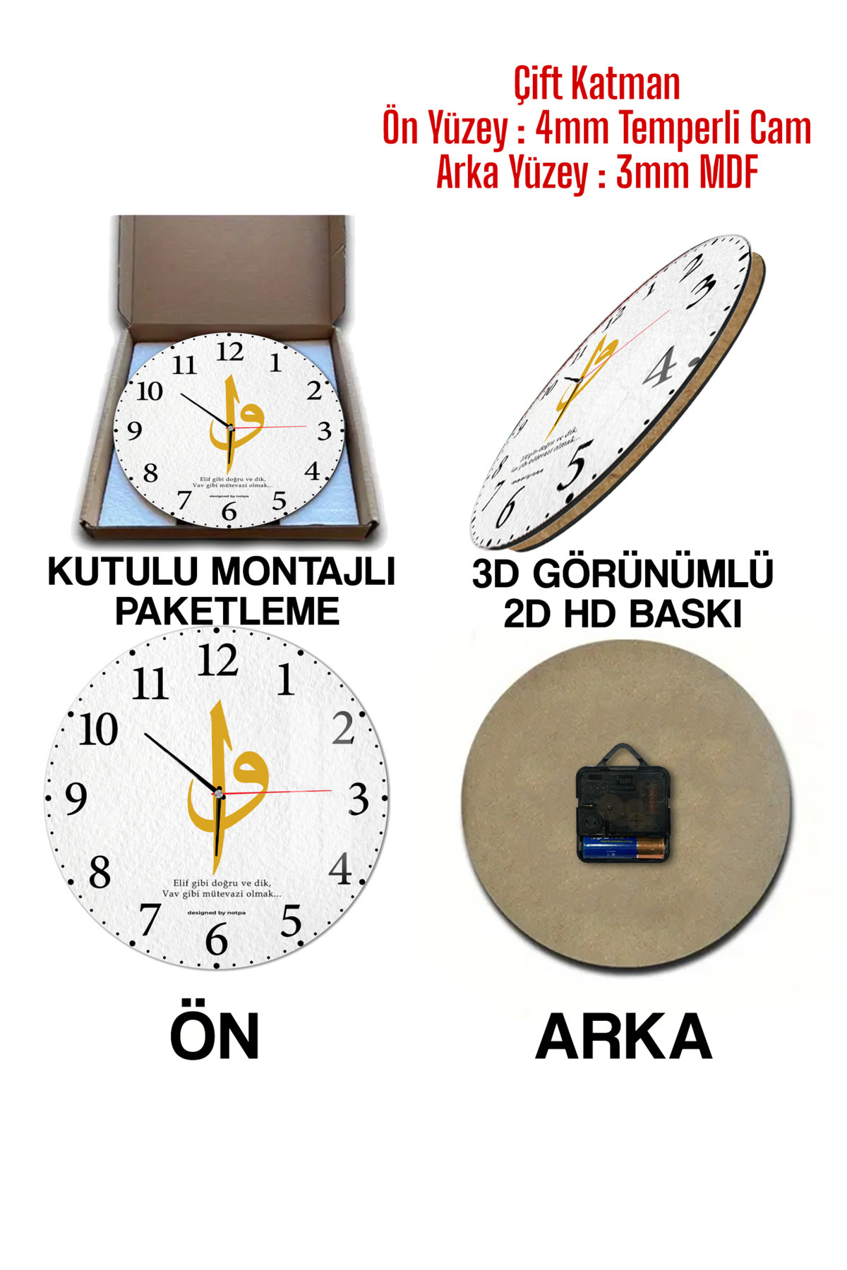Elif gibi dik, Vav gibi mütevazı... 3D Görünümlü Temperli Cam Saat – 33 cm CSDW037