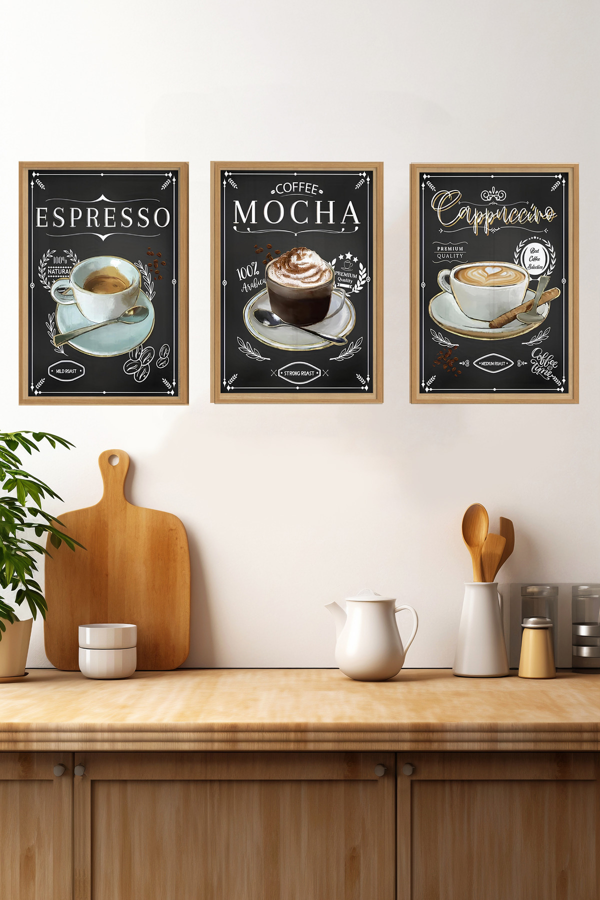 ☕ Espresso Mocha Cappuccino – 3’lü MDF UV Baskılı Kahve Tablo Seti (3 Ebat Seçeneği) CRVS1021