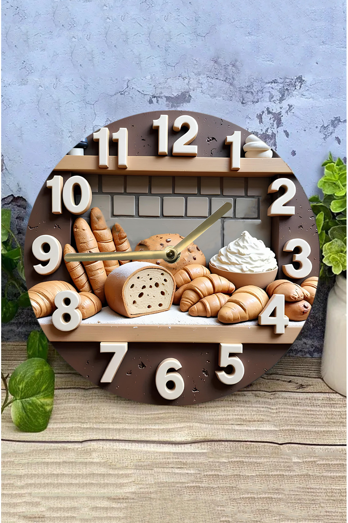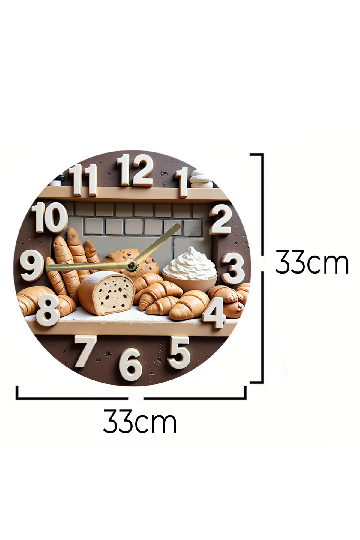 🥖 Fırın Temalı Çift Katmanlı MDF Duvar Saati | 33 cm | Ekmek ve Kruvasan Desenli Saat Sdw355