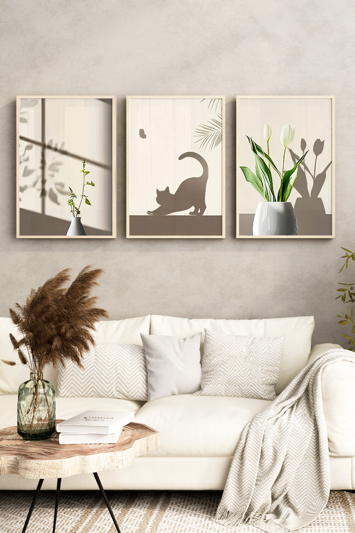 🌿 Gölge Efektli Bitki ve Kedi Silüeti Temalı Çerçeveli 3’lü Tablo Seti 🌿 CRV1096