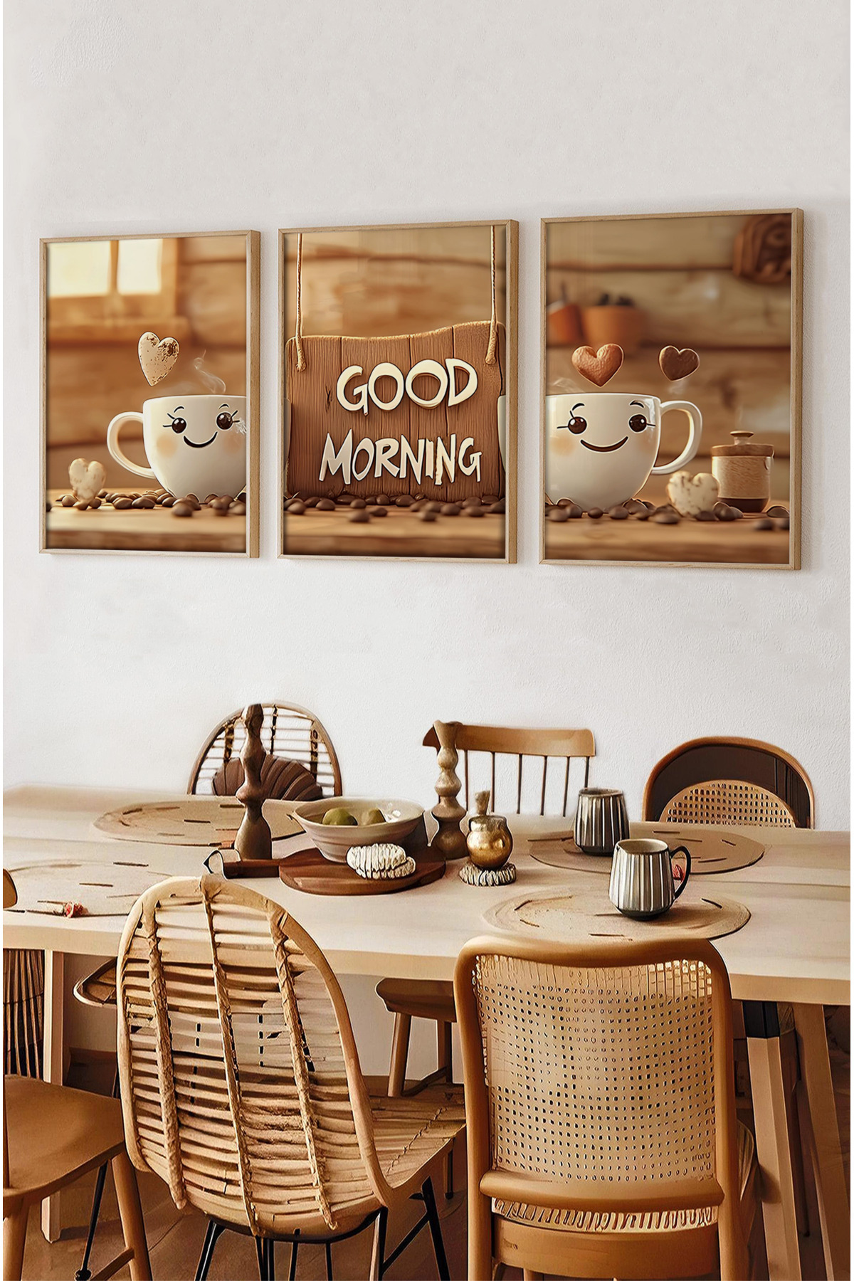 🖼️ Good Morning - Neşeli Kahve Temalı 3’lü Çerçeveli Tablo Seti CRV1022