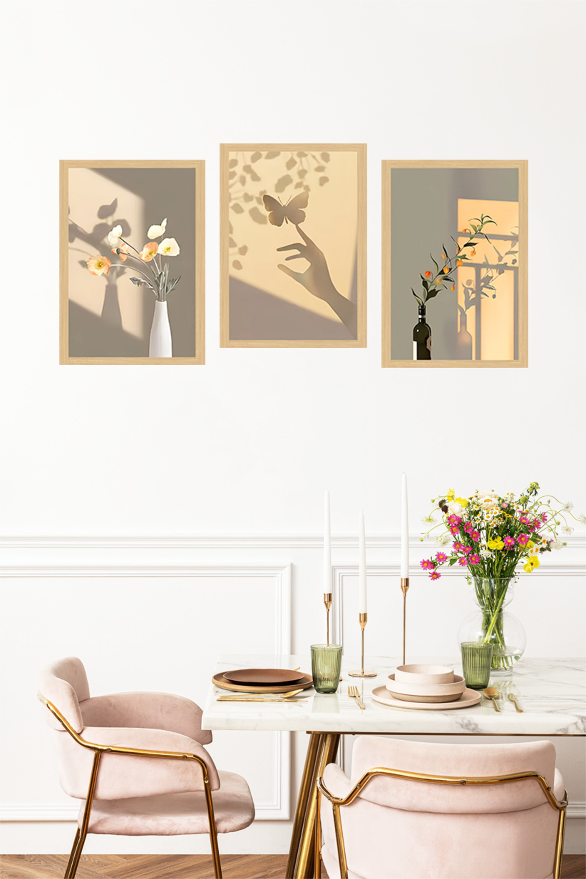 🌿 Gün Işığında Gölge Çiçekler ve Kelebek Temalı 3'lü Çerçeve Görünümlü Tablo Seti🌟 CRVS1100