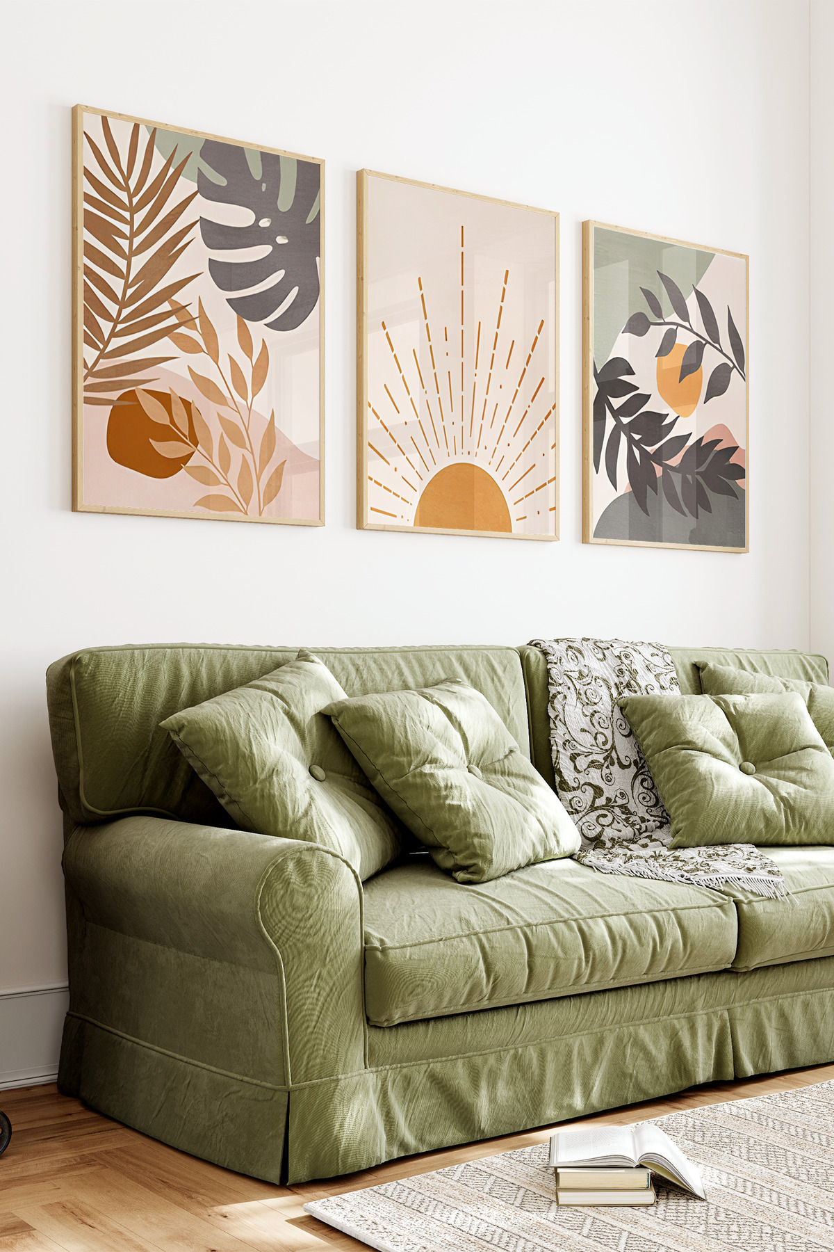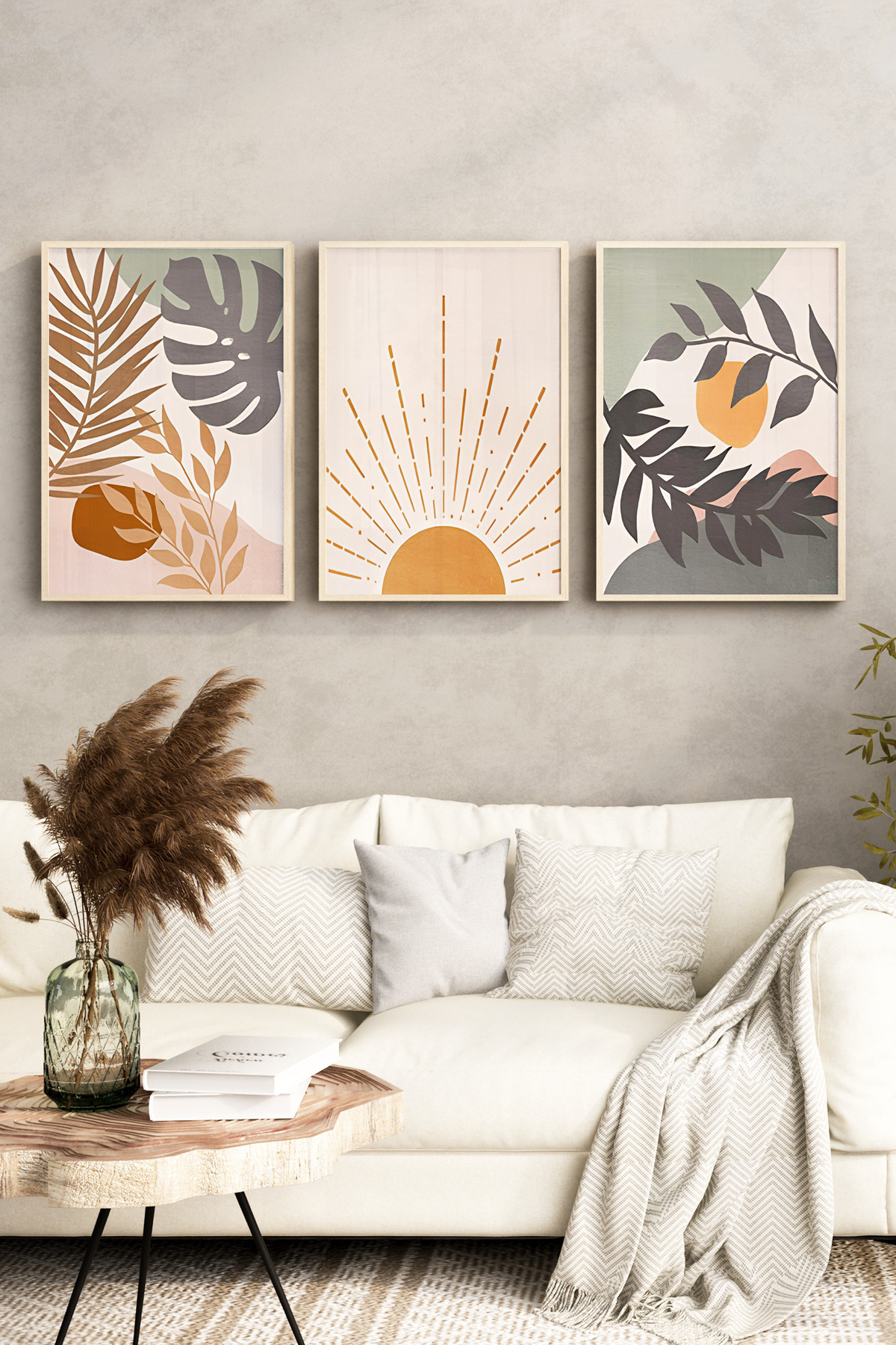🌿 Güneş ve Yaprak Temalı 3’lü Ahşap Çerçeveli Tablo Seti🌿 CRV1138