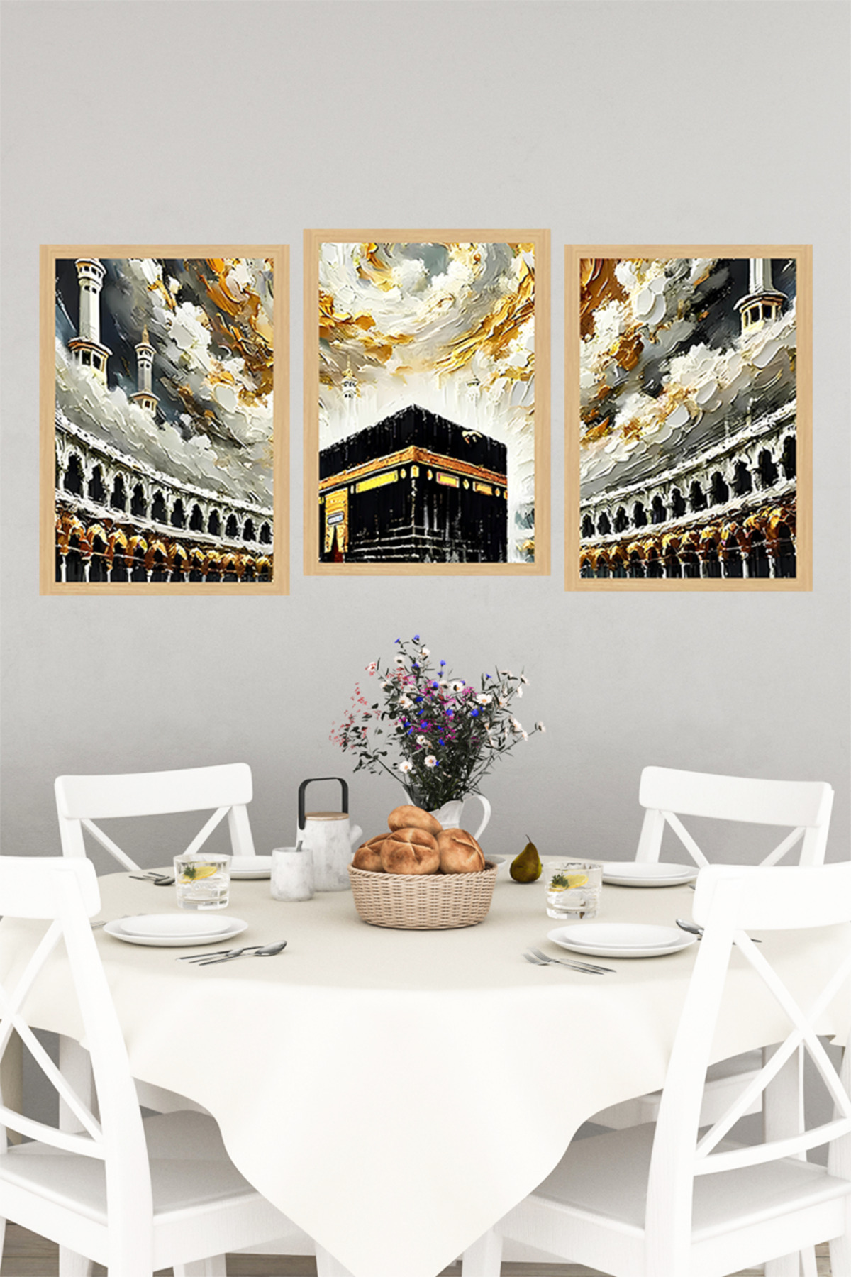 🕋 Kâbe Manzaralı 3’lü Tablo Seti–Manevi Atmosferin Şıklığıyla Buluşması Çerçeve Efektli🌟 CRVS1227