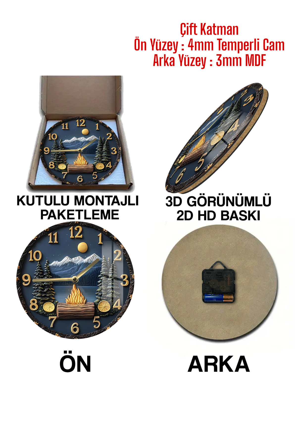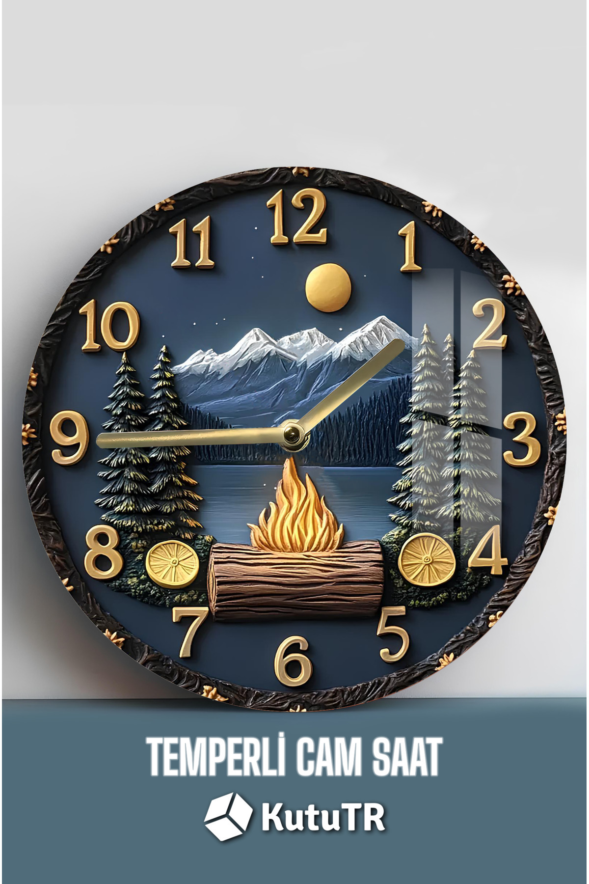 Kamp Ateşi Temalı Tasarım 3D Görünümlü Temperli Cam Saat – 33 cm CSDW046