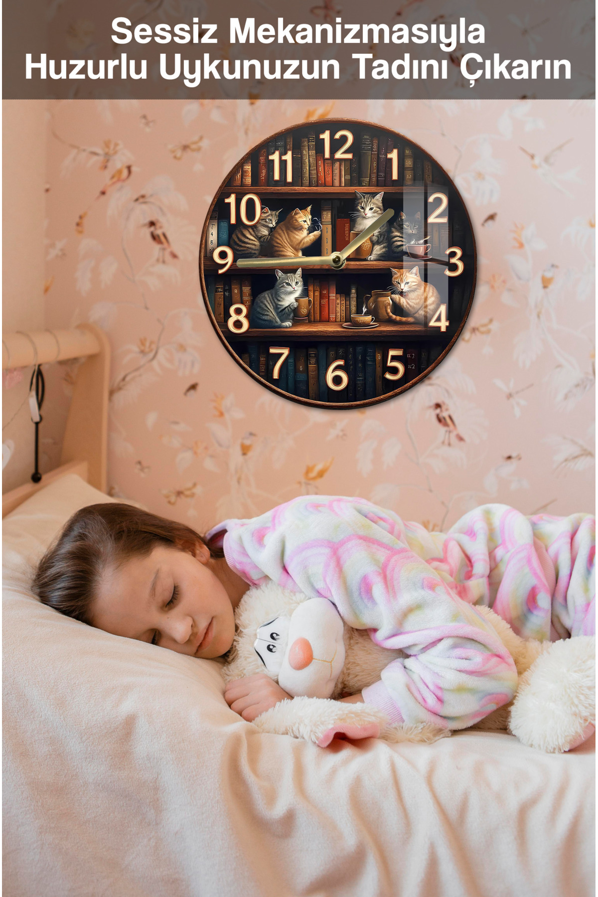 Kütüphane Temalı Sevimli Kedi Desenli 3D Görünümlü Temperli Cam Saat – 33 cm CSDW018