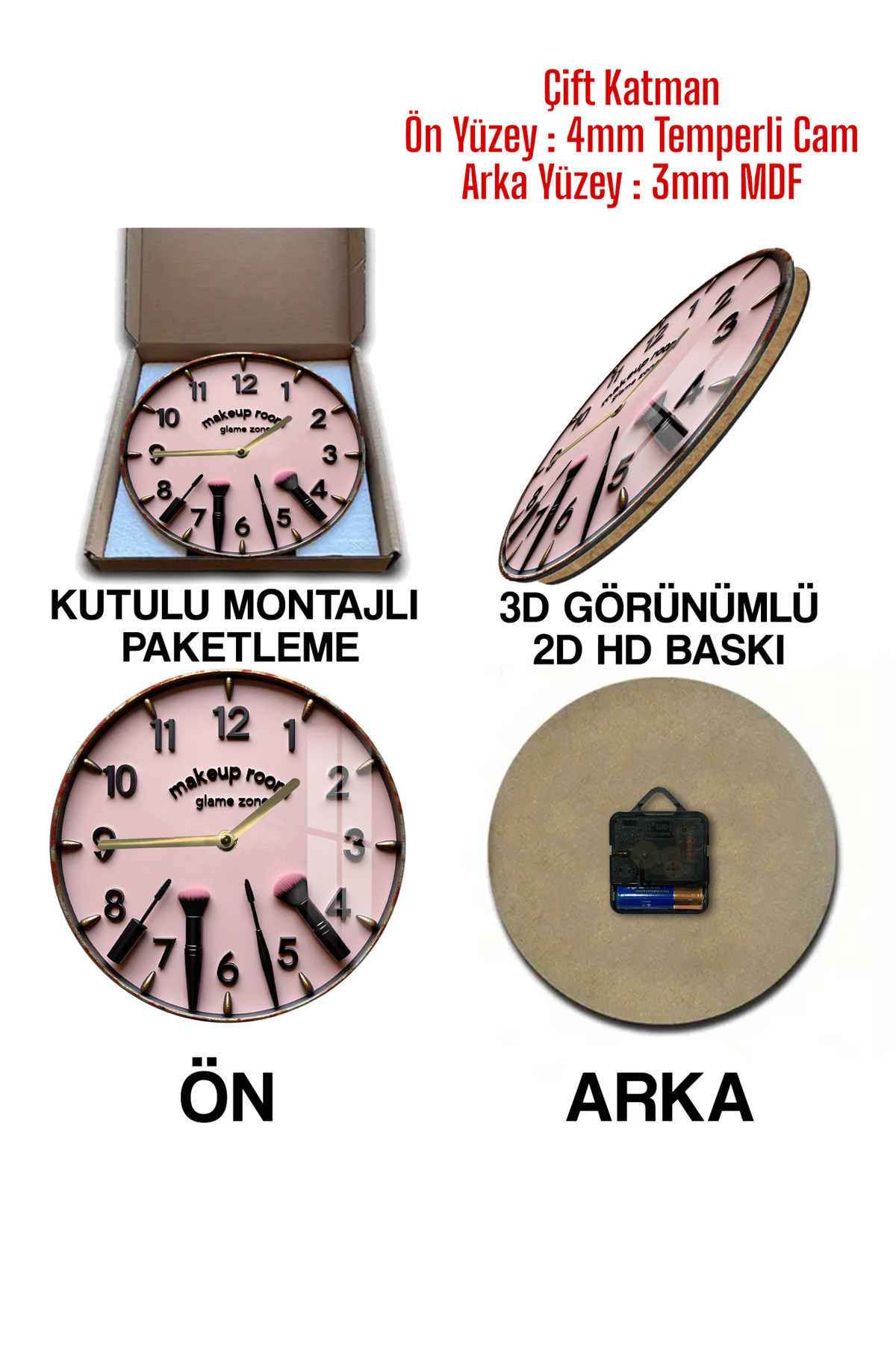 Makeup Room Glam Zone Tasarımlı 3D Görünümlü Temperli Cam Saat – 33 cm CSDW336