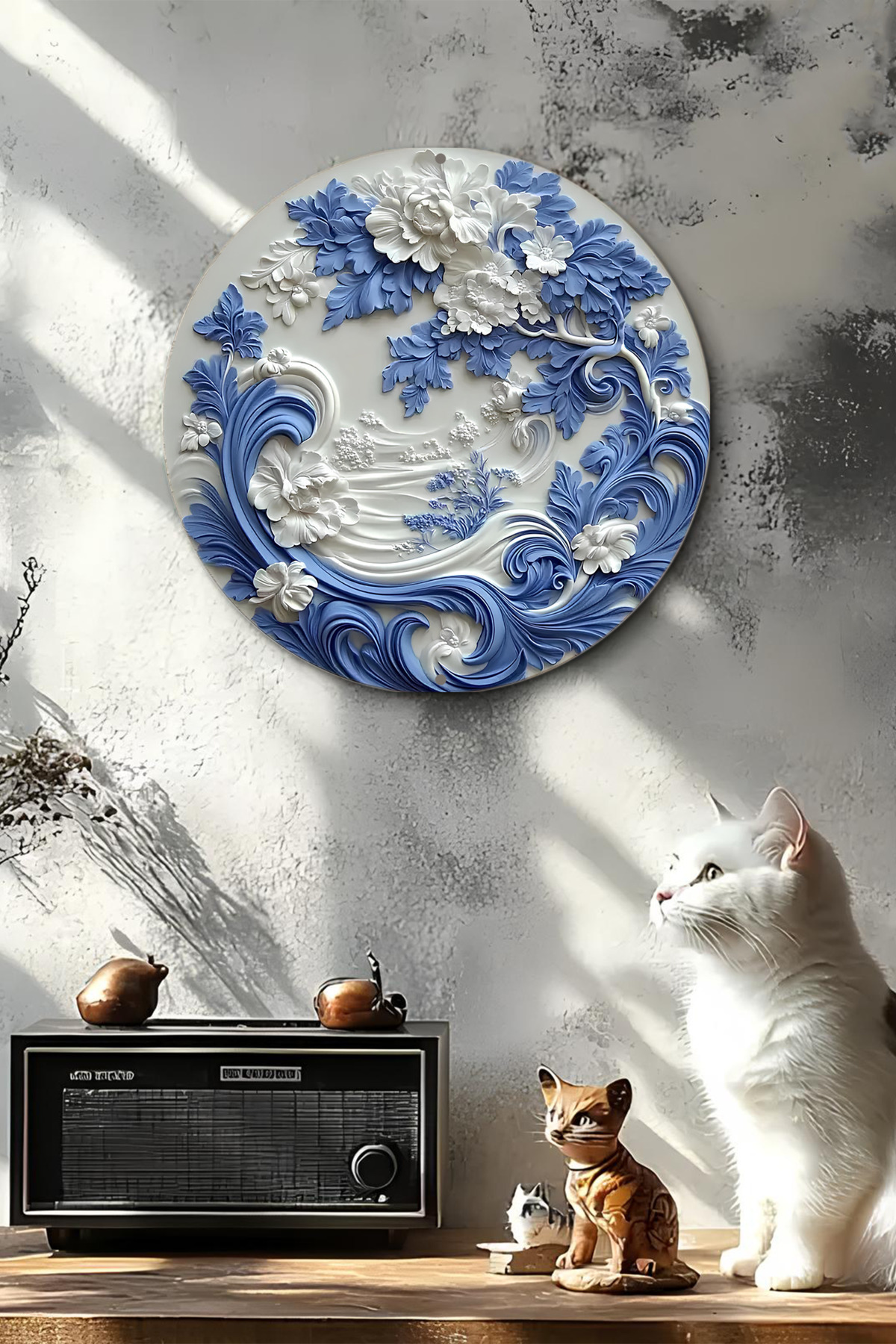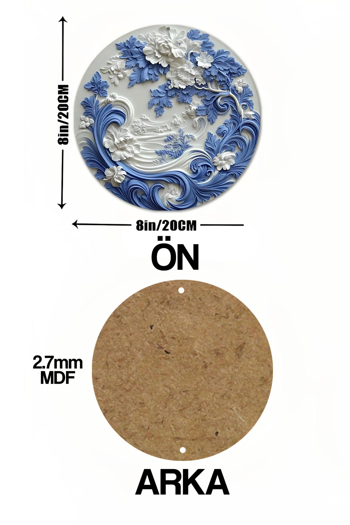 🌊 Mavi Beyaz Çiçek Dalga Temalı 3D Görünümlü MDF Duvar Süsü – 20 cm DT038