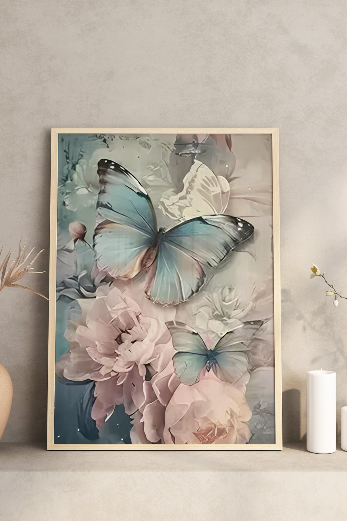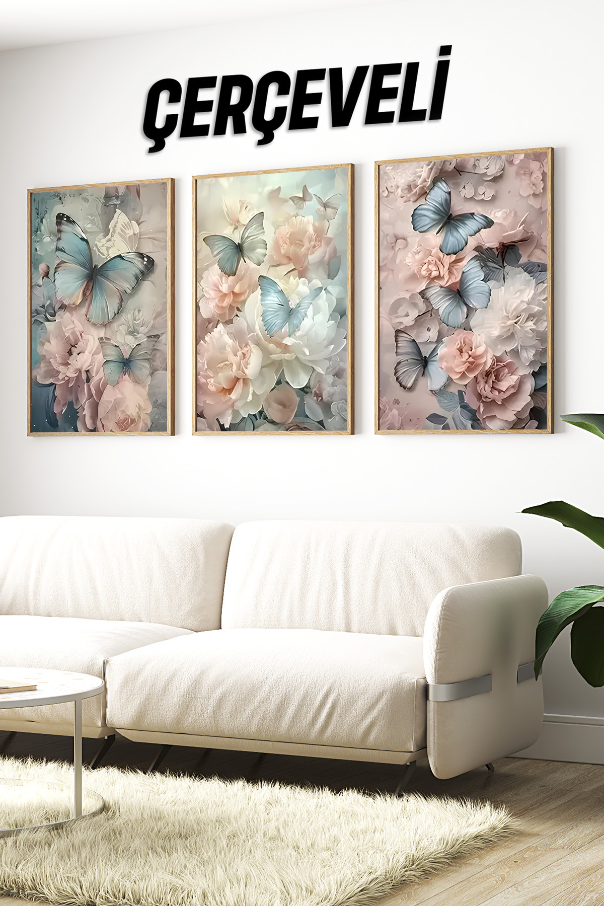🦋 Mavi Kelebek ve Çiçek Desenli 3'lü Tablo Seti 🌿 CRV1117