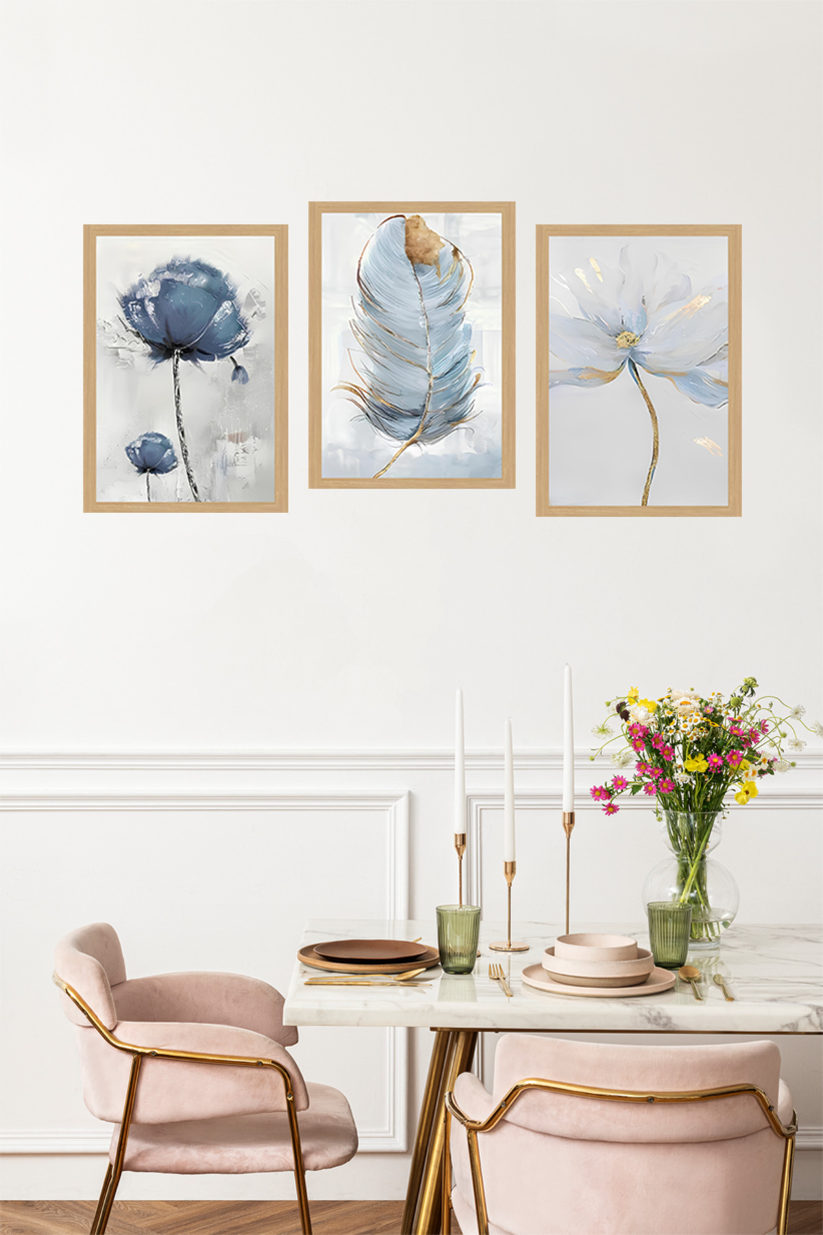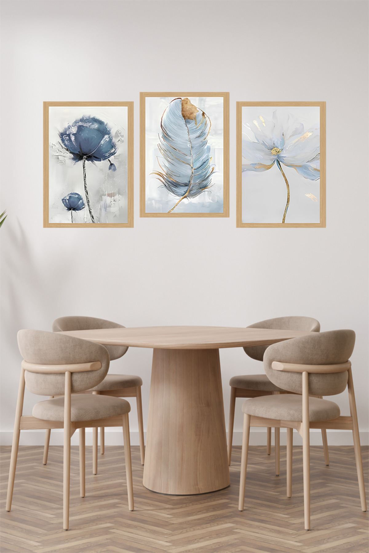 🖼️ Mavi Tonlarda Çiçek ve Tüy Desenli 3'lü Tablo Seti - Çerçevesiz UV Baskılı CRVS1055