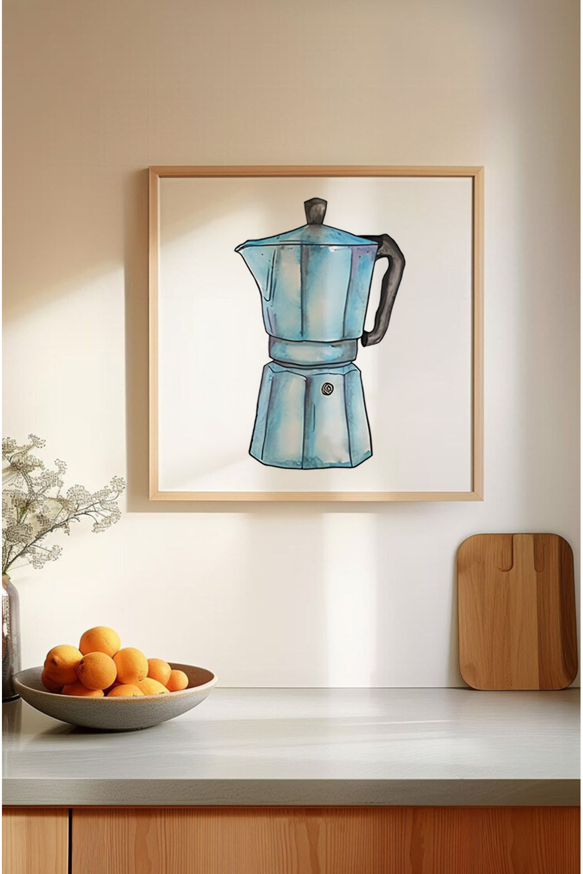 🔵 Maviyle Başlayan Lezzetli Hikâyeler – 3’lü MDF Kahve Temalı Çerçeveli Tablo Seti KR4060